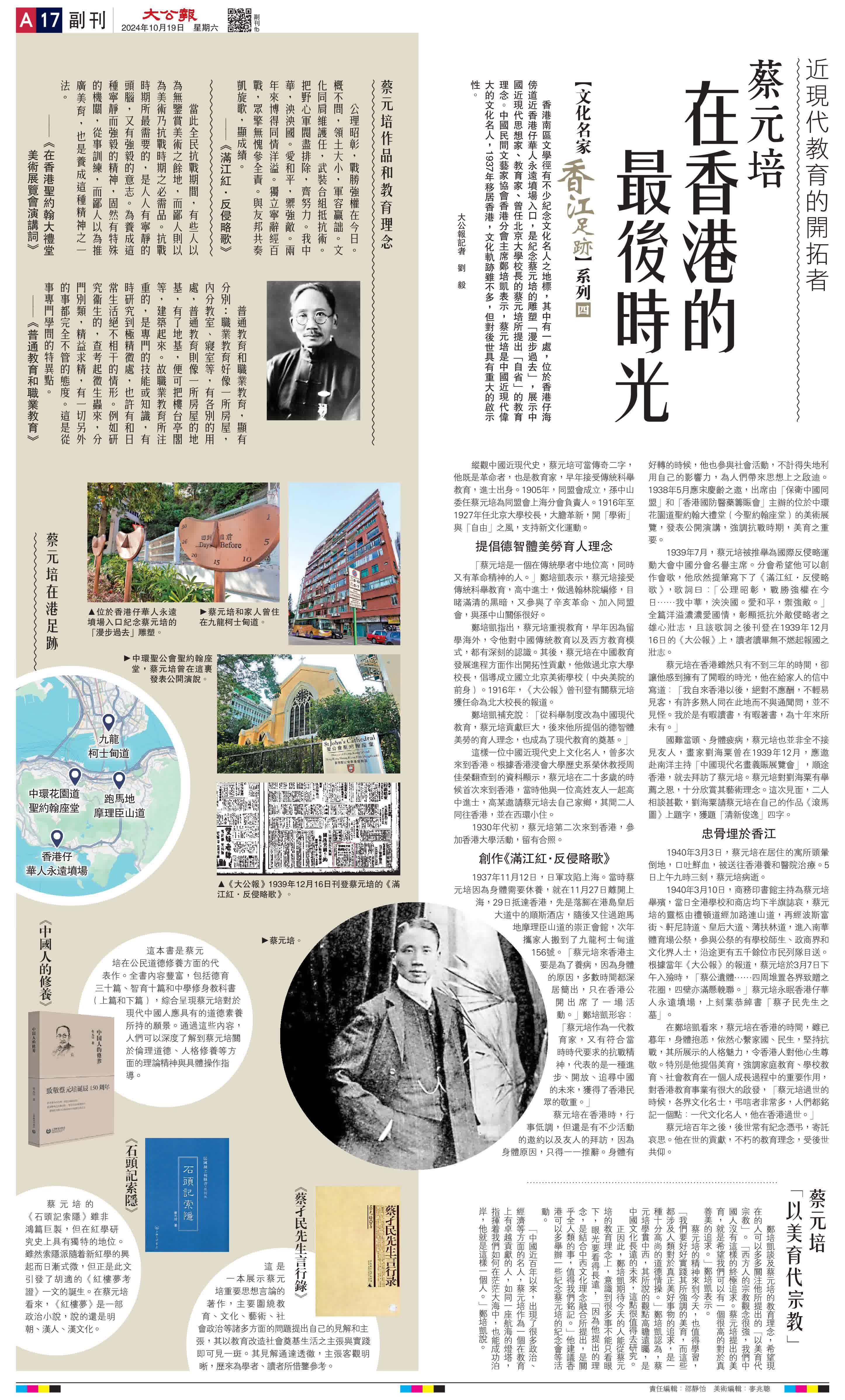 (大公報記者 劉 毅)香港南區文學徑有不少紀念文化名人之地標,其中有一處,位於香港仔海傍道近香港仔華人永遠墳場入口,是紀念蔡元培的雕塑「漫步過去」,展示中國近現代思想家、教育家、曾任北京大學校長的蔡元培所提出「自省」的教育理念。中國民間文藝家協會香港分會主席鄭培凱表示,蔡元培是中國近現代偉大的文化名人,1937年移居香港,文化軌跡雖不多,但對後世具有重大的啟示性。