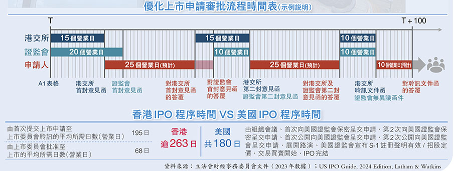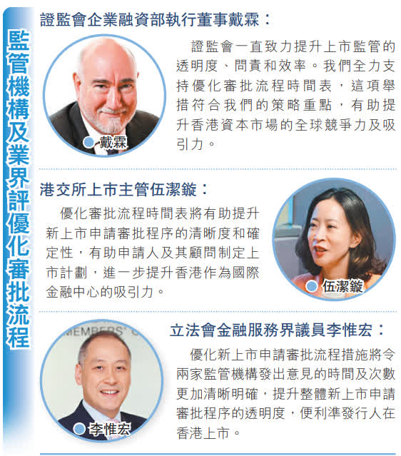 證監會及聯交所指出,優化審批流程時間表將令兩家監管機構發出意見的時間及次數更加清晰明確,提升整體新上市申請審批程序的透明度,便利準發行人在香港上市。