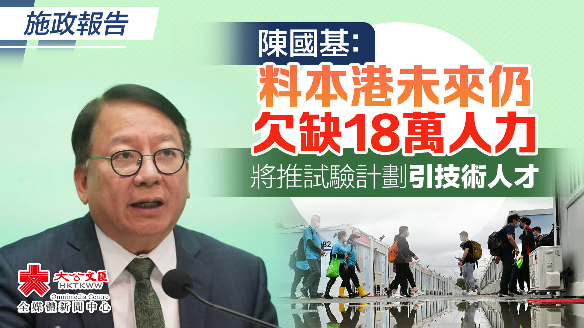陳國基表示,當局估計本港未來仍欠缺18萬人才和人力,尤其是中層技術人才,例如技工及維修人員約有6萬個空缺。當局將推出相應的試驗計劃,容許持有相關牌照的技術人才來港工作。高才通方面,他表示當局已批8萬多人,兩成半左右年均收入超250萬元。
