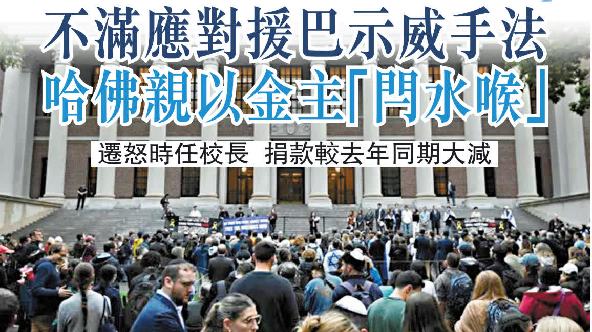 香港文匯報報道,全美多間大學今年初爆發撐巴勒斯坦反戰校園抗議活動,哈佛大學收到的校友捐贈因此下滑。《華爾街日報》與彭博通訊社引述哈佛大學周四(10月17日)財報顯示,截至今年6月30日的過去一年內,該校收到合共11.7億美元(約61億港元)捐贈,較去年同期的13.8億美元(約72億港元)跌幅近15%。分析指多名校友金主不滿校方應對抗議手法,削減或撤回資助。