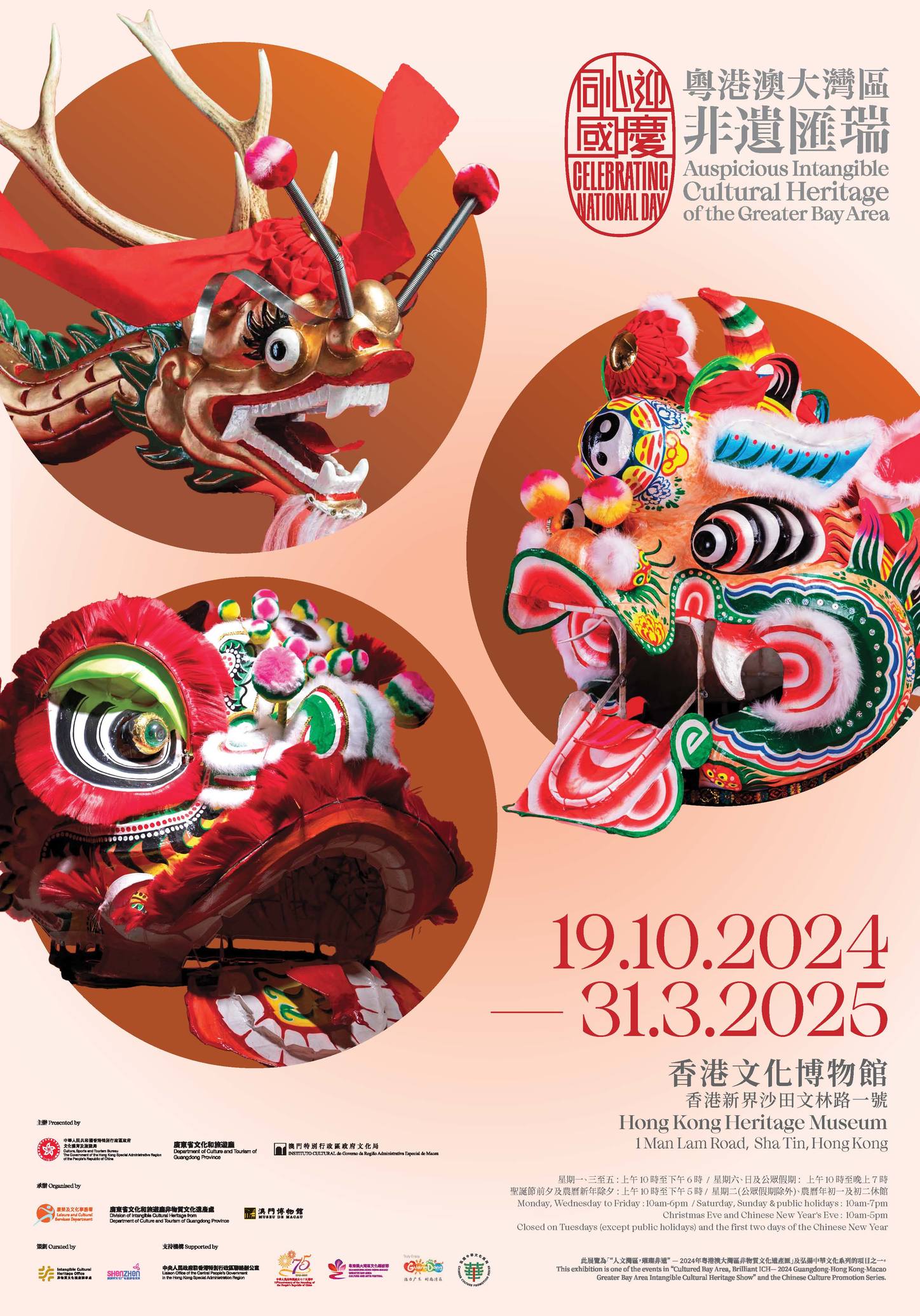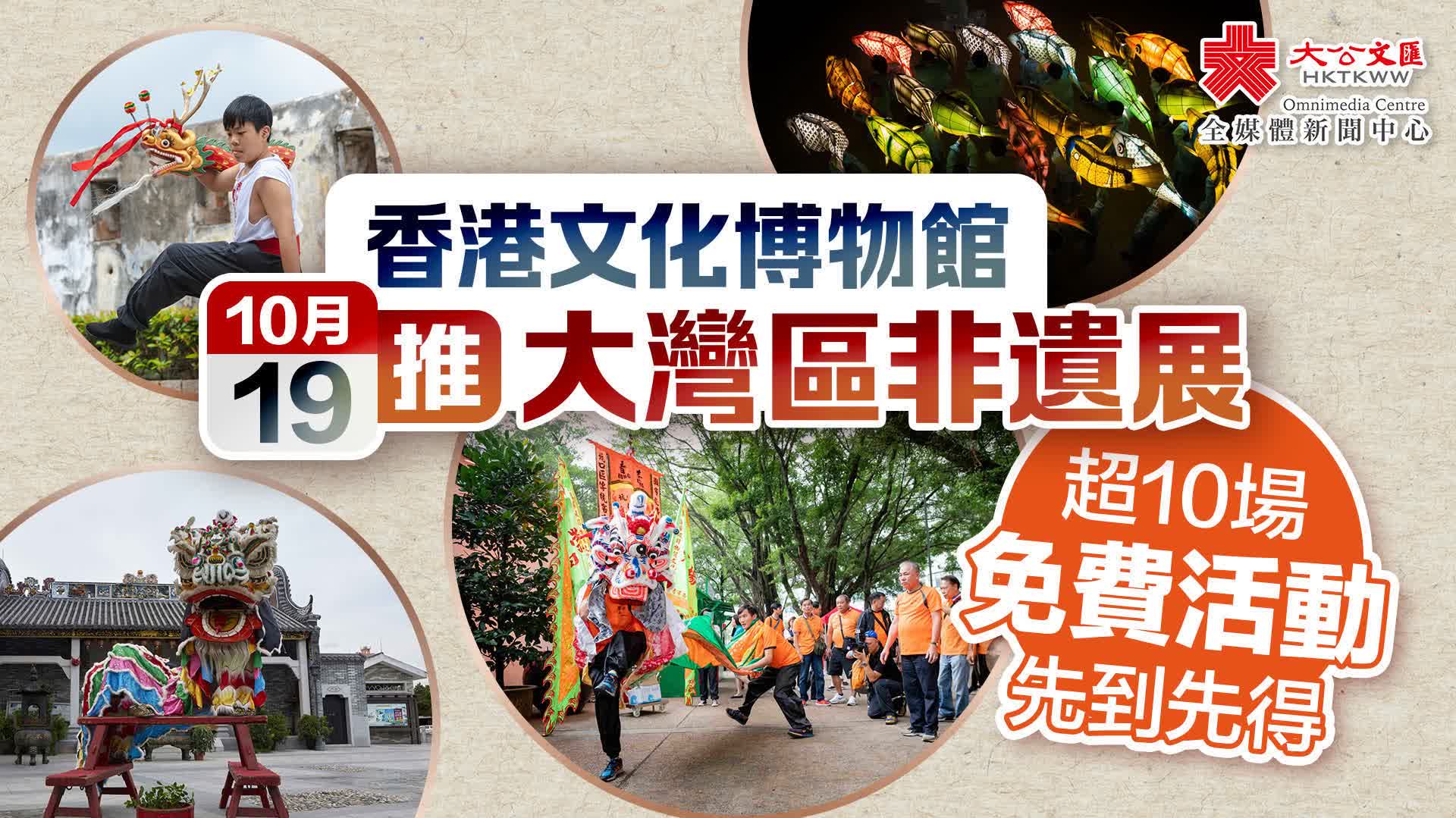 大公文匯全媒體報道,香港文化博物館今日(19日)起推出「粵港澳大灣區非遺匯瑞」展覽,以「瑞獸」為主題,介紹11個大灣區城市的非物質文化遺產,包括香港「西貢坑口客家舞麒麟」、澳門「魚行醉龍節」及佛山「彩紮獅頭」等。展期到明年3月31日,免費入場。