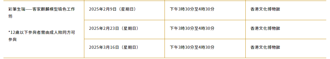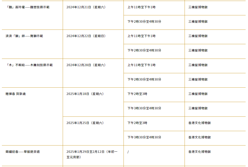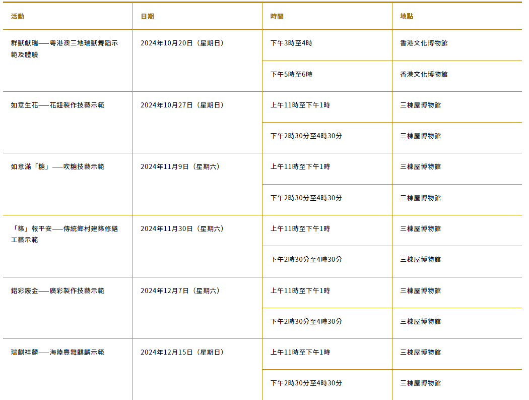本次展覽不僅會展示精湛的非遺技藝展覽,還會於香港文化博物館和三棟屋博物館安排各種技藝示範及互動體驗活動,向公眾介紹非遺的多樣面貌,包括花鈕製作、吹糖技藝、客家麒麟模型填色工作坊等等。體驗活動均為免費,即場參加,先到先得。