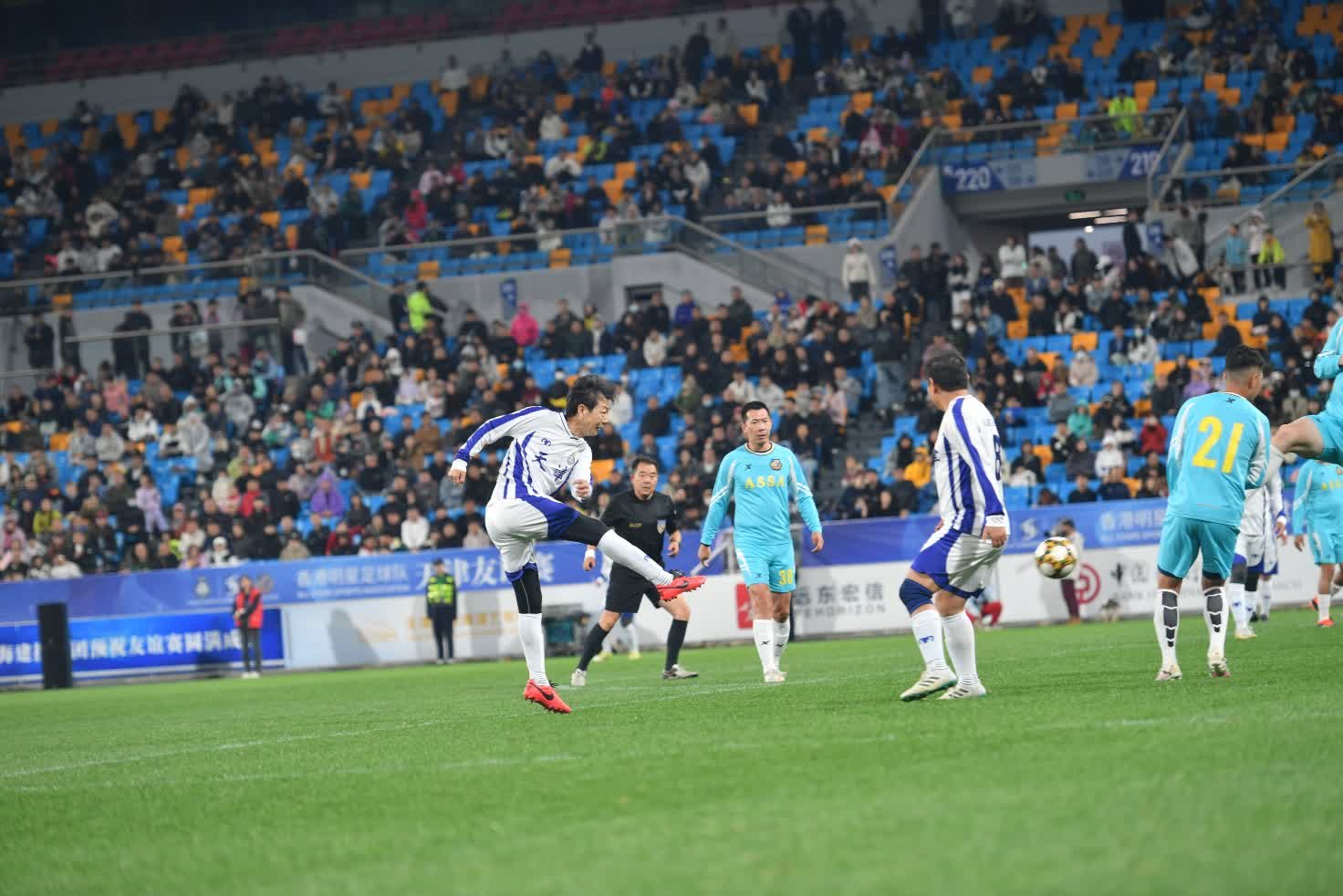 中場休息時,香港明星足球隊的球員們為現場觀眾帶來了精彩的「中場大秀」,演唱了多首膾炙人口的經典粵語老歌,引發了全場觀眾的大合唱。賽場瞬間變成了一場大型演唱會現場,觀眾們紛紛打開手機閃光燈,全場大合唱一次次將現場氣氛推向高潮,共同演繹了一場難忘的「回憶殺」。