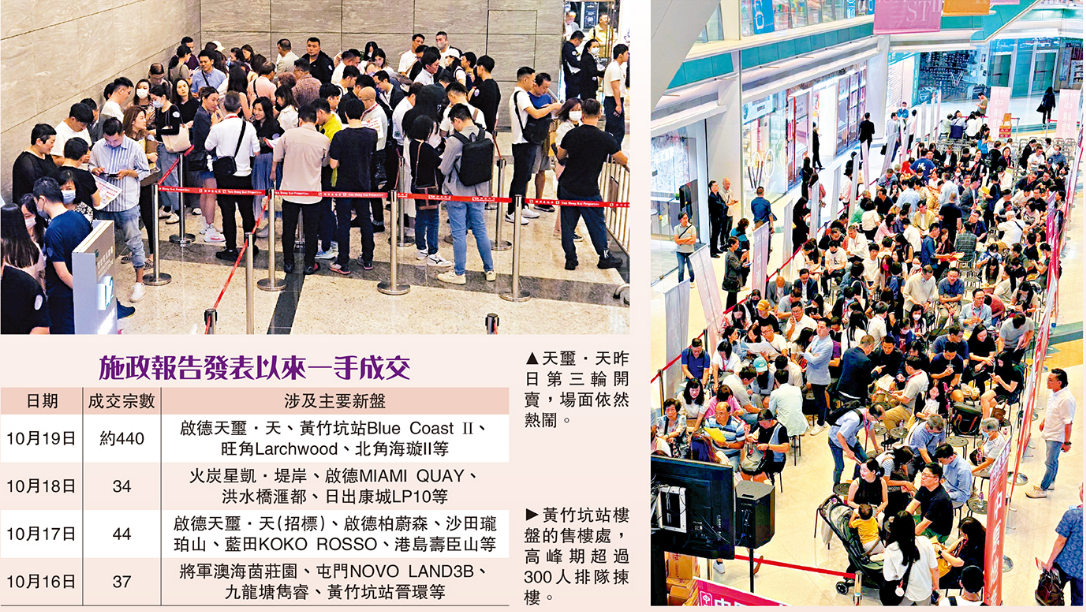 (大公報記者 梁穎賢)內地出台一攬子增量政策,推動經濟增長,同時施政報告出台措施支持樓市,及本港銀行減息,投資者信心回升。昨開賣的兩個鐵路盤收旺場,長實(01113)黃竹坑站Blue Coast II首輪推售256伙,市傳售近75%約188伙;新地(00016)旗下啟德天璽·天第三輪以價單形式推售215伙,市傳到黃昏時段售罄。