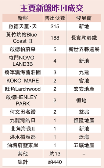 綜合市場消息,施政報告公布後,新盤成交越戰越勇。昨日在兩個焦點鐵路新盤撐場下,全日一手共錄近440宗成交,是施政報告發表當日的10倍,而施政報告公布4日以來共錄550宗成交,為本月暫錄近2000宗成交的逾四分一。