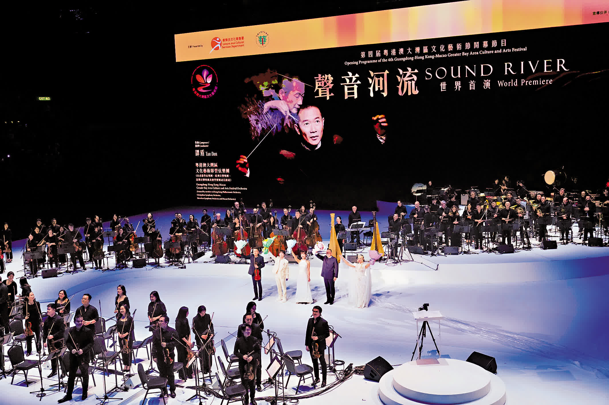 (大公報記者 徐小惠)第四屆「粵港澳大灣區文化藝術節」開幕典禮暨開幕節目《聲音河流》昨晚(19日)在香港體育館舉行。本屆藝術節以「多元融合——創造無限機遇」為主題,由香港首次擔任主辦城市,將在接下來的一個月裏,在大灣區「9+2」城市展開超過260場的文化活動,涵蓋表演藝術、博物館展覽、圖書館活動、電影放映會等,包括粵港澳三地共同合作的節目,促進大灣區各城市的交流和合作,展現大灣區充滿創意的多元文化魅力。