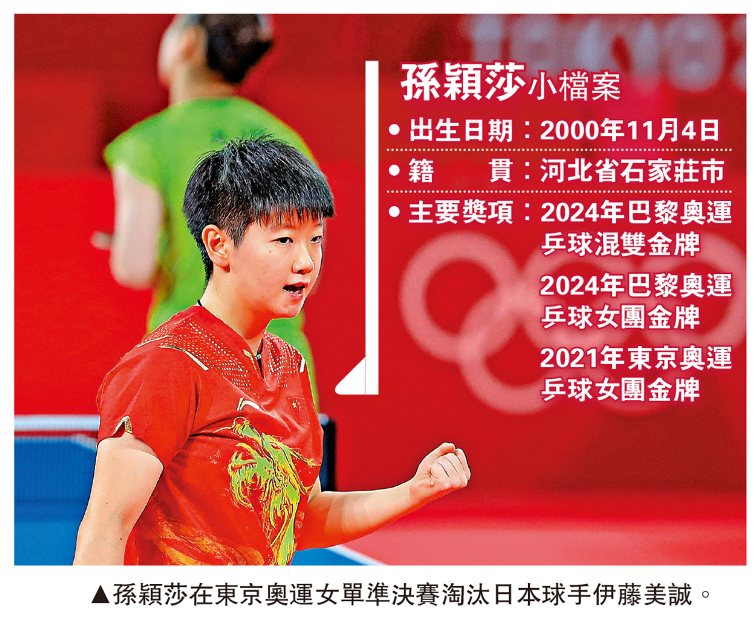 東京奧運大名單上,孫穎莎的名字出現在女單席位─那時候,距離孫穎莎平生第一次拿起乒乓球拍只過去了16年,距離她看到張怡寧奪冠的北京奧運會也只過去了13年。