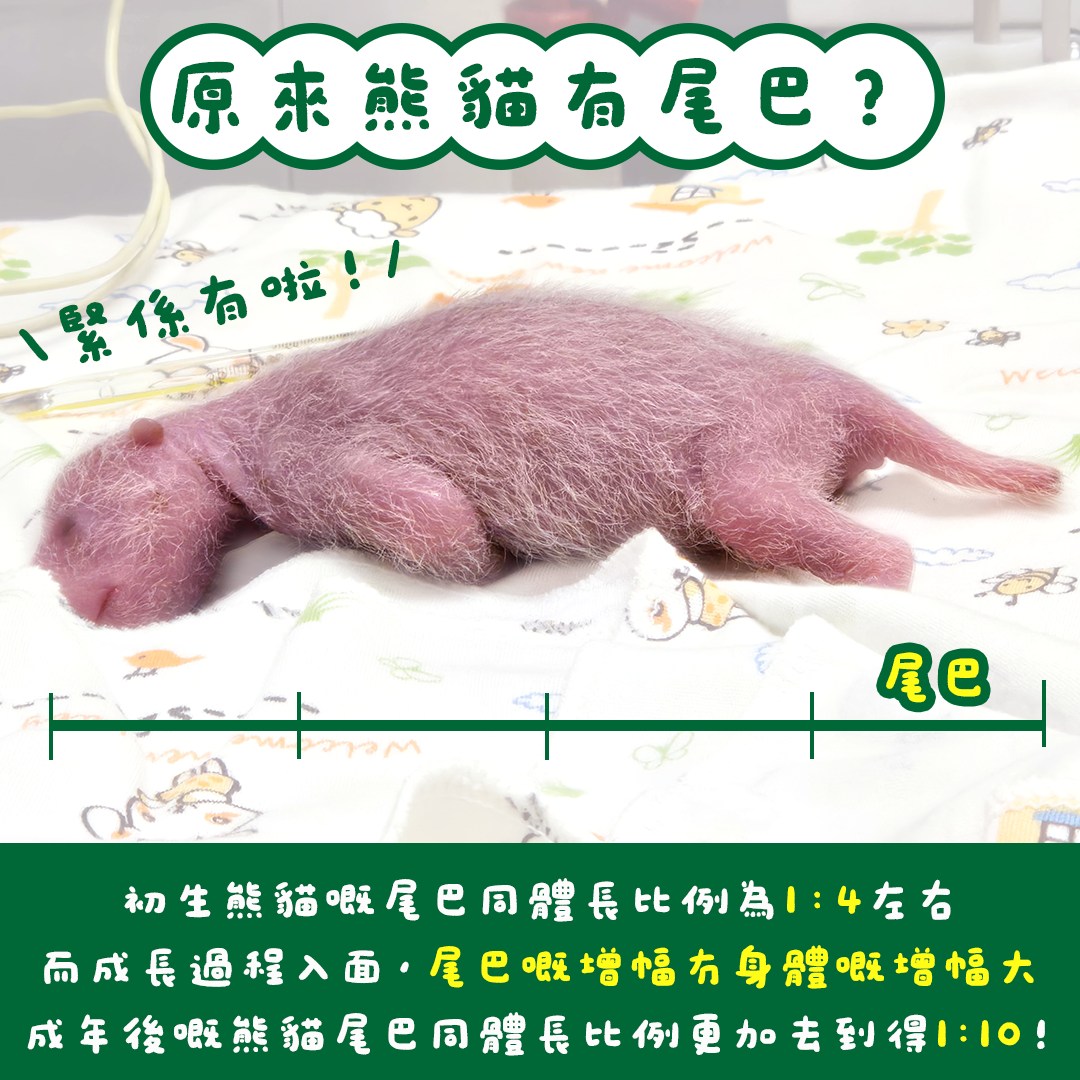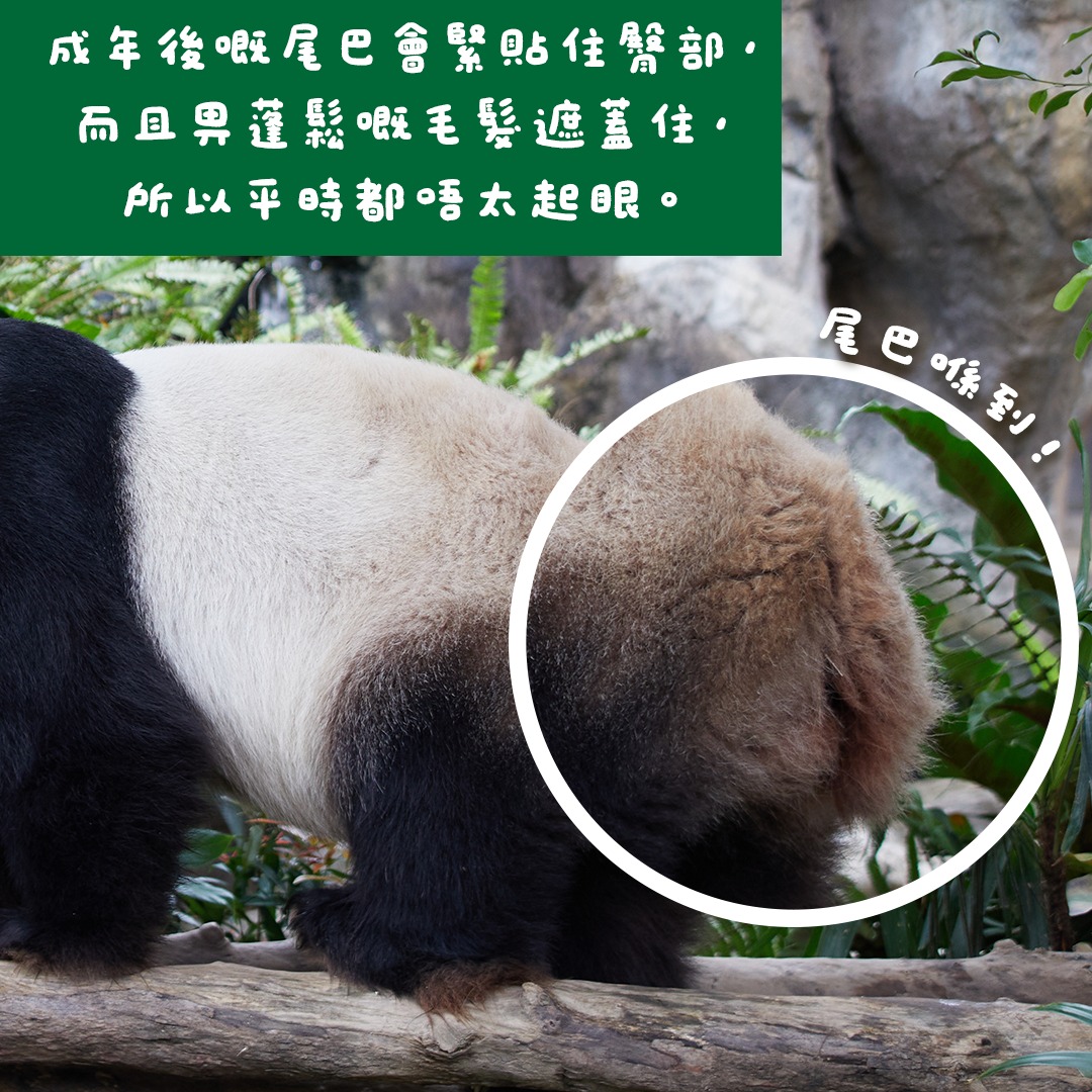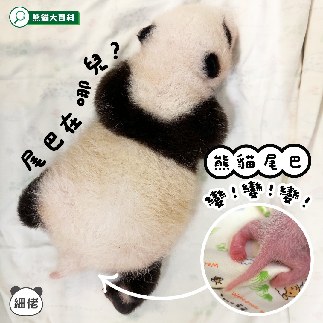 園方解釋,初生大熊貓的尾巴和體長比例為1:4左右,而成長過程中,尾巴的增幅沒有身體的增幅大,成年後的熊貓尾巴和體長比例更加達到1:10,加上成年後的尾巴會緊貼臀部,而且被蓬鬆的毛髮遮蓋住,因此平時都不太起眼。