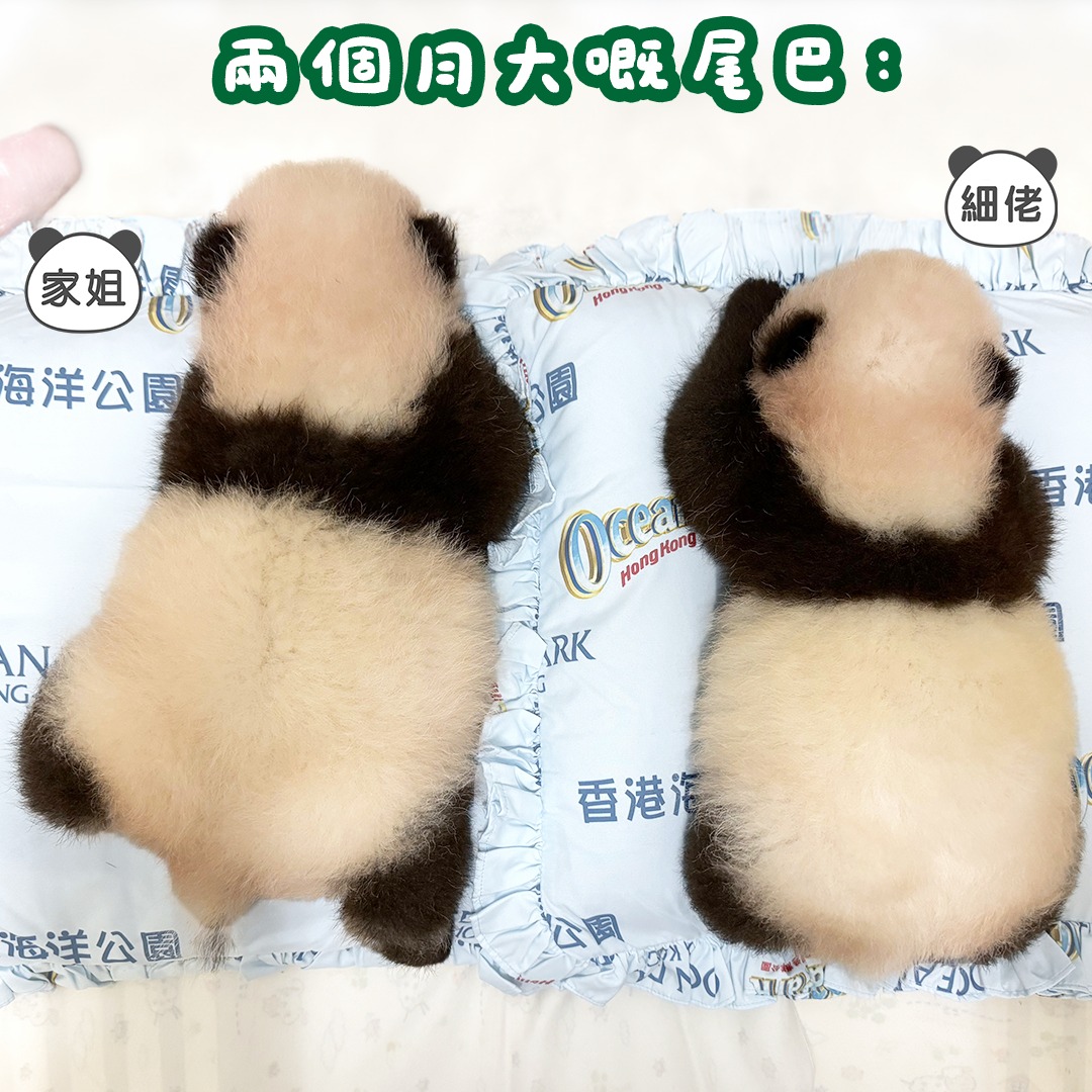 大公文匯全媒體記者報道,大熊貓龍鳳胎自出生以來,已經從粉嘟嘟的BB狀,穿上了「黑白條紋馬甲」,並睜開了雙眼。隨着BB們的大熊貓特徵越來越明顯,不知道你會不會留意到牠們的尾巴開始「消失不見」了呢?大熊貓尾巴也會像蝌蚪一樣隨着長大而退化消失嗎?海洋公園今日(20日)在社交平台解惑,指大熊貓尾巴會隨着體型變化隱藏在臀部下面,只是不易察覺,並非消失不見。