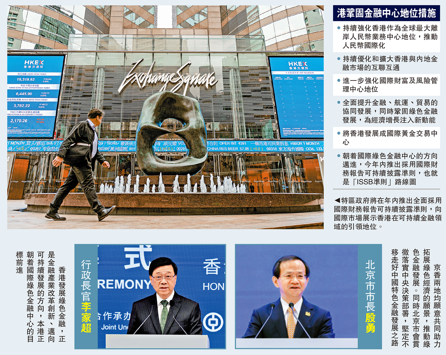 (大公報 記者 陳思華、馬曉芳)「2024金融街論壇年會」於18至20日在北京舉辦,本屆論壇以「信任和信心─共商金融開放合作,共享經濟穩定發展」為主題,匯聚全球30多個國家和地區、超過500位重量級嘉賓,論壇亮點同步設立香港分會場,昨日的閉幕式特邀行政長官李家超及北京市市長殷勇致辭。李家超表示,特區政府將在年內推出全面採用國際財務報告可持續披露準則,向國際市場展示香港在可持續金融領域的引領地位,鞏固香港國際金融中心的地位。北京市市長殷勇表示,京港兩地均願意共同助力開展綠色經濟的願景,推動綠色金融發展。