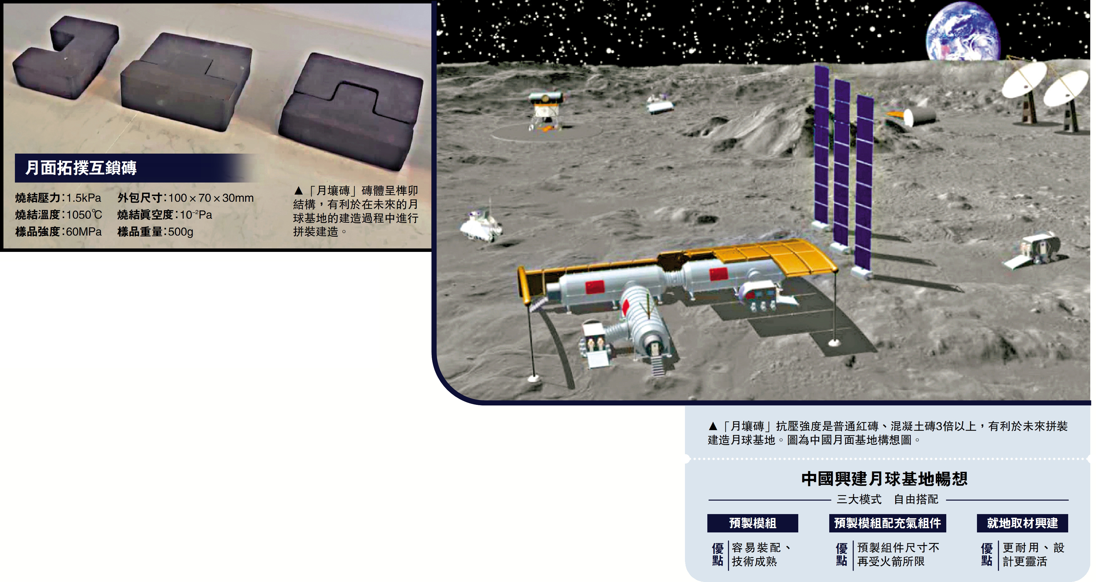 最新消息顯示,中國科學家模擬月壤成分燒製成「月壤磚」,磚體呈榫卯結構,其抗壓強度是普通紅磚、混凝土磚3倍以上,有利於未來拼裝建造月球基地。「月壤磚」預計搭乘天舟八號貨運飛船在飛往中國空間站做暴露實驗,驗證力學、熱學性能,以及能否經受得住宇宙輻射。