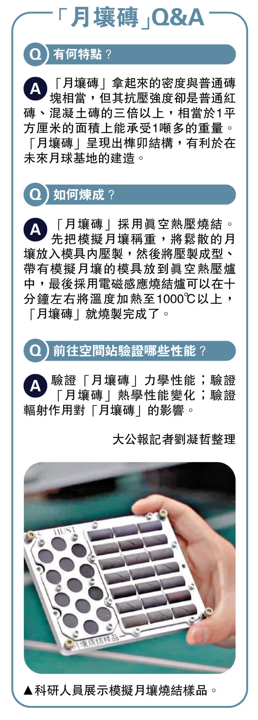 為了搞清楚「月壤磚」能不能勝任月球造房子的任務,近日,中國科學家模擬月壤成分燒製而成的「月壤磚」,將搭乘「天舟八號」貨運飛船前往中國空間站。在完成太空實驗後,第一塊「月壤磚」預計將在2025年年底返回地球。