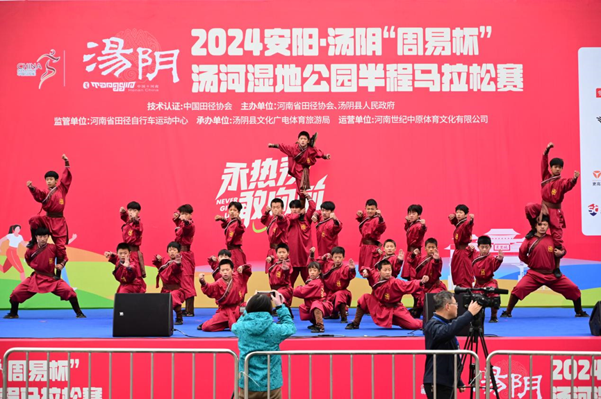 跑一場馬拉松,壯一身英雄氣,本屆賽事由「岳家軍」震撼出場,不僅有岳家拳特色表演,還有「岳家軍」方陣,為賽事增添了濃厚的文化氣息。在參賽服裝和獎牌設計上,也充分運用了湯陰歷史文化的重要元素,參賽服裝背後有「盡忠報國」印,完賽獎牌設計以我國民族英雄宋岳忠武王廟、周易太極八卦、四大名艾之首的湯陰北艾為主要設計元素,讓參賽者在奔跑在同時都能沉浸在湯陰這座千年古縣的歷史文化氛圍以及優美的自然風光之中。