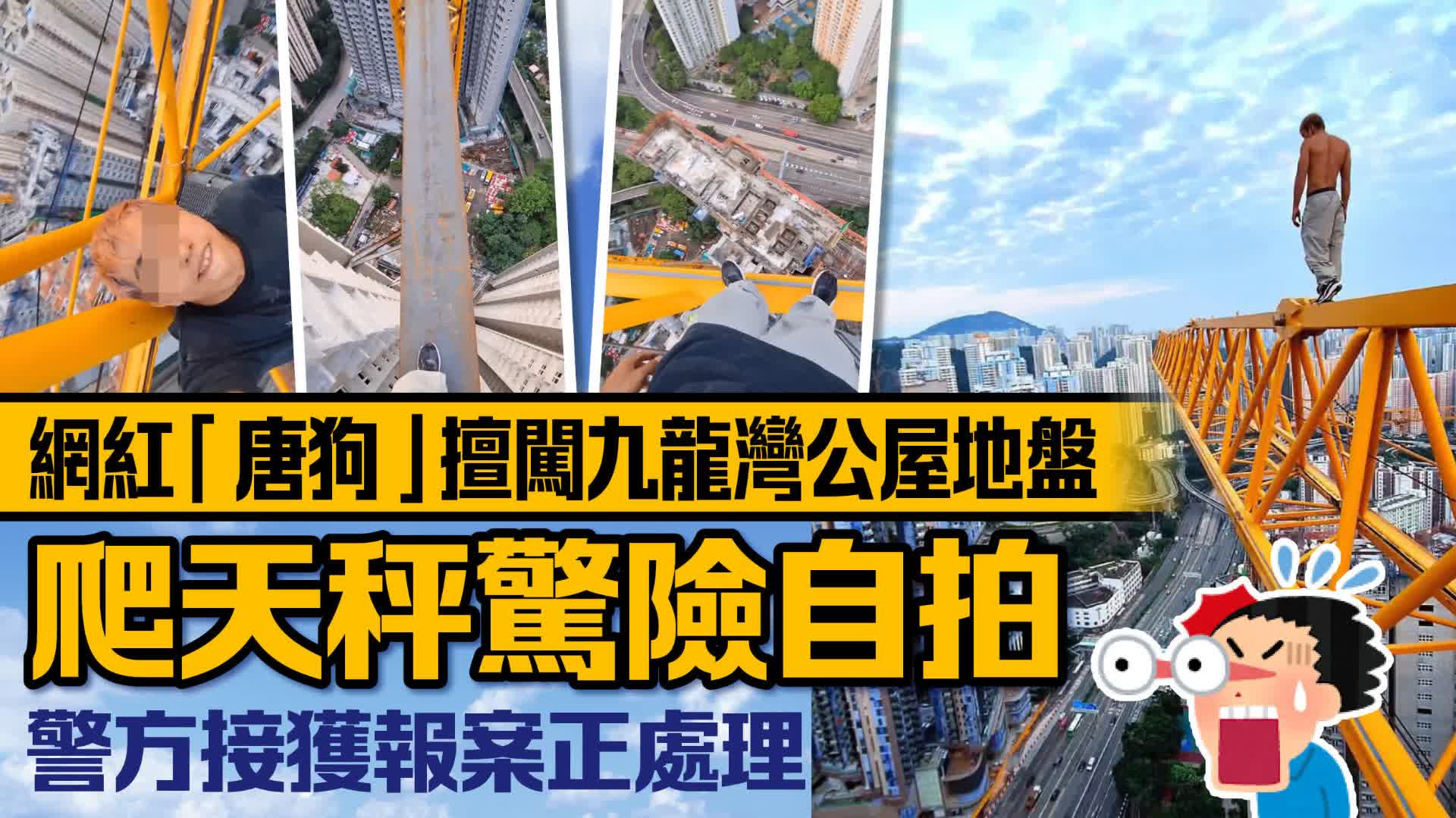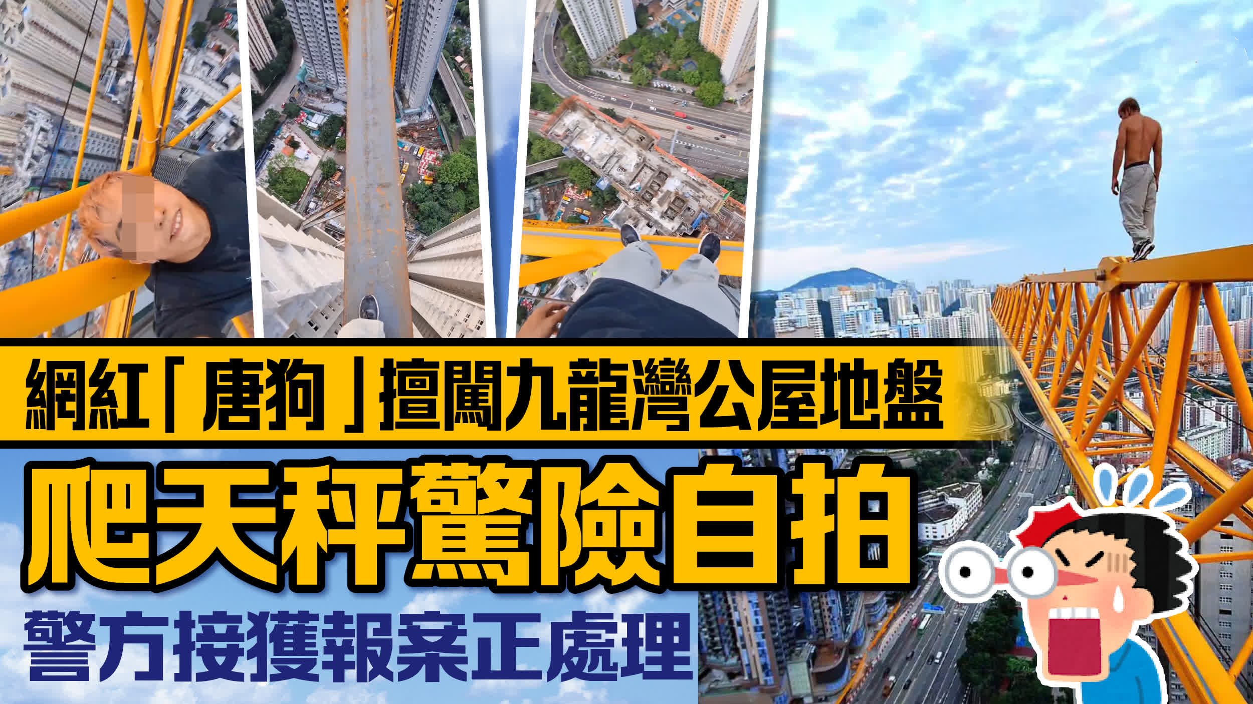 大公文匯全媒體報道,上周三(16日),青年網紅「唐狗」在Instagram上傳了一段影片,片中顯示,他擅自闖入九龍灣公屋地盤,並在沒有任何安全措施下,徒手爬上天秤,俯瞰九龍東的景色,更脫去上衣自拍,相當驚險。他在片中豪言,「室外嘅樓底係最高,唔信你出去望下。」警方稱,在19日上午已接獲報案,懷疑有人攀爬牛頭角宏照道一個公屋地盤的天秤,警方暫時將案件列作「雜項」處理。