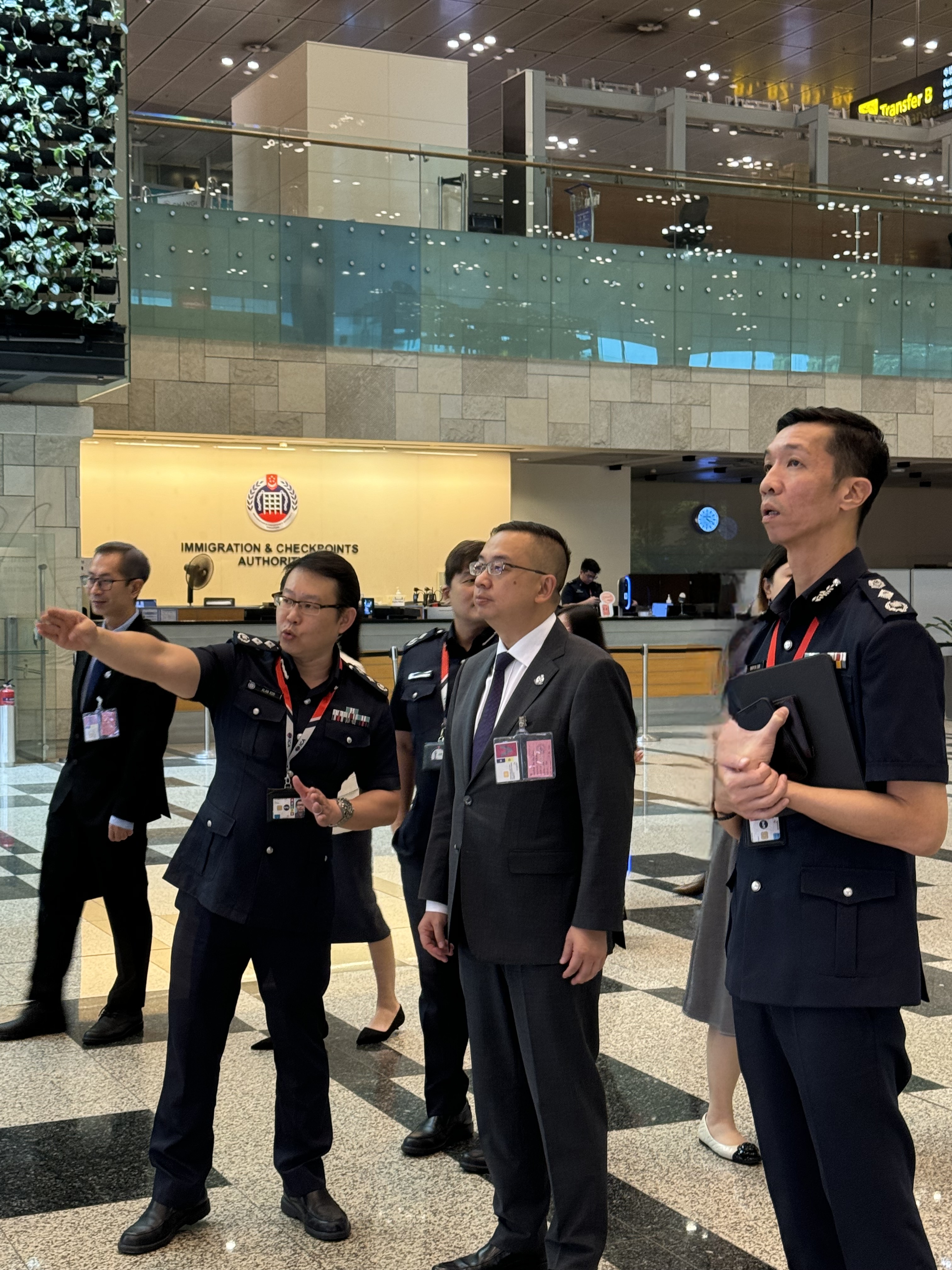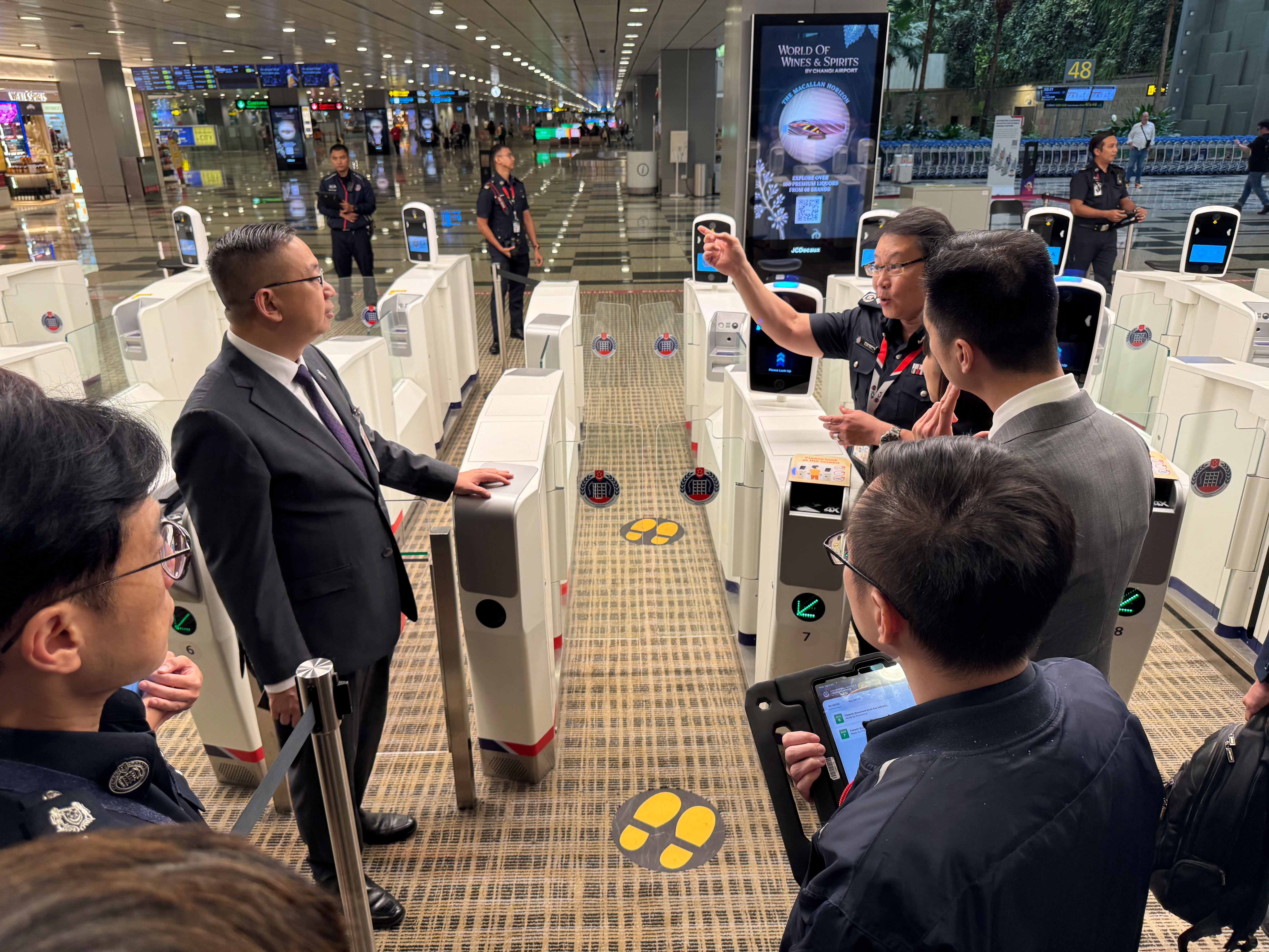 郭處長近日率領入境處同事出訪新加坡,訪問團首先與新加坡移民與關卡局(Immigration & Checkpoints Authority)會面,就出入境事務和創新科技的應用交換經驗,並且參觀了新加坡樟宜機場以及兀蘭陸路關卡,了解當地最新的自助出入境設施及人流管理策略。