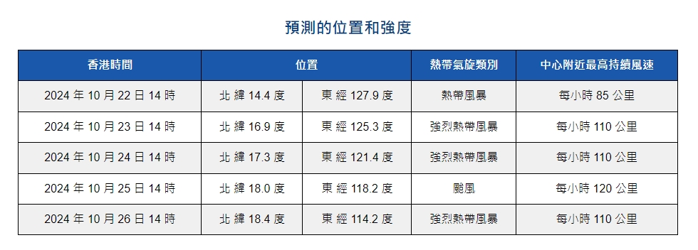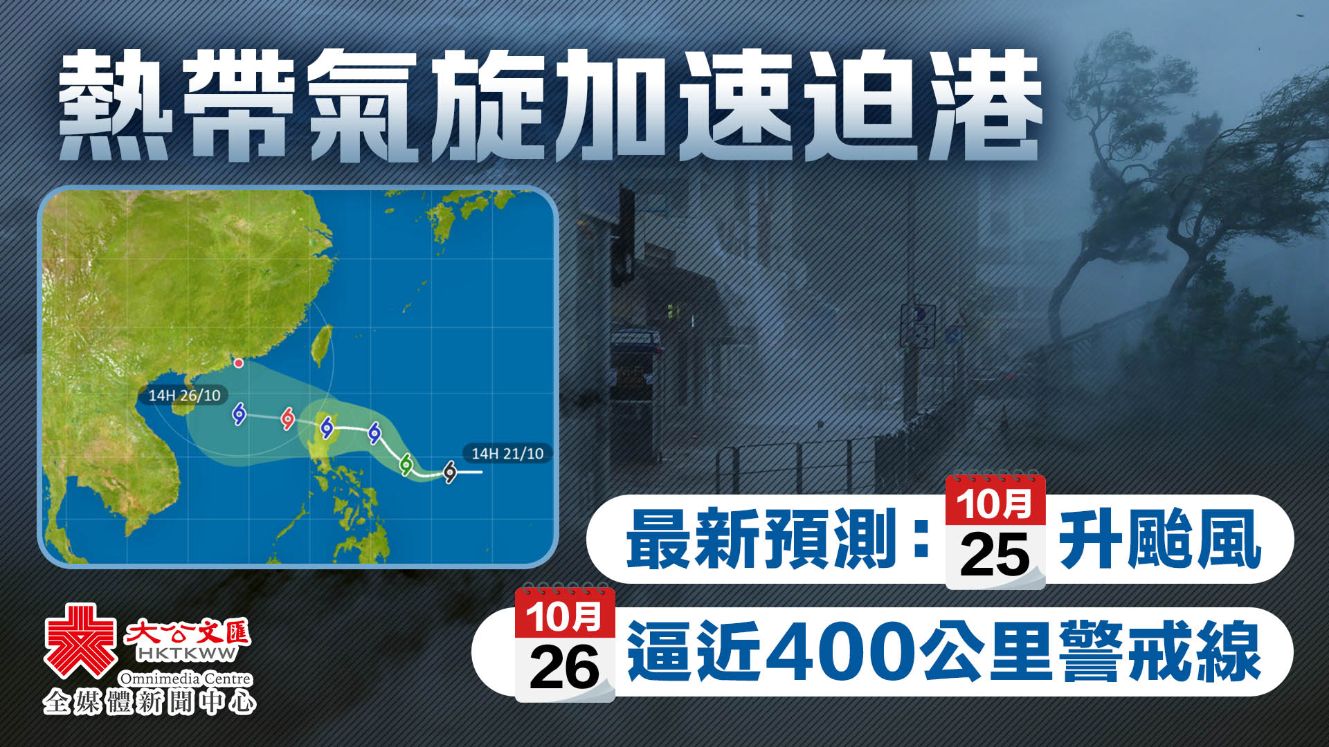 天文台今日凌晨公布初步路徑預測,指該熱帶氣旋預計於本周六增強為「颱風」並進入本港800公里範圍;到早上8時,天文台更新預測,指熱帶氣旋於本周六會以颱風姿態進入本港600公里;而在下午2時最新公布,天文台預計該熱帶氣旋本周五會升格為「颱風」,進入本港600公里範圍,到周六再逼近至400公里範圍。