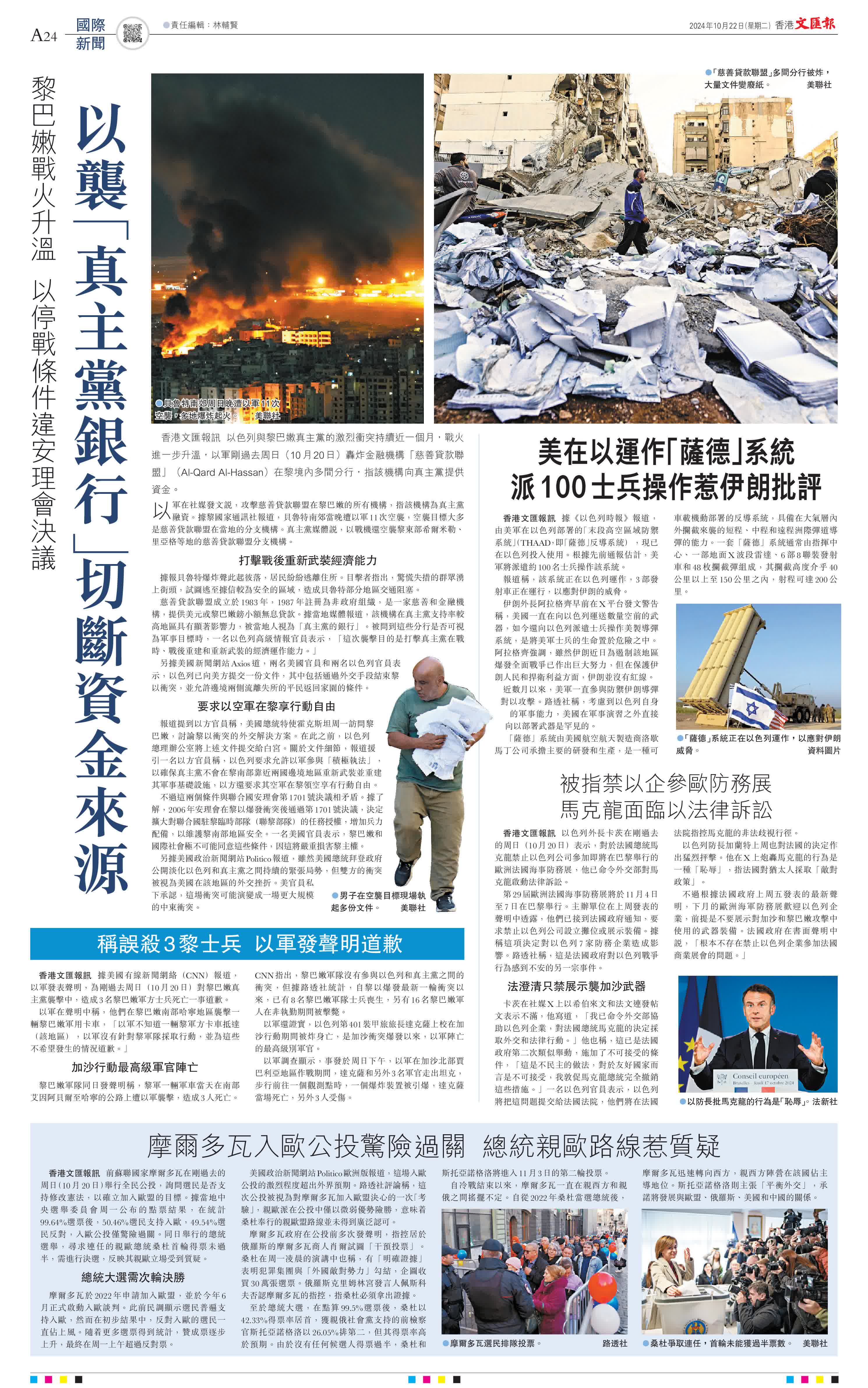 香港文匯報綜合報道,以色列與黎巴嫩真主黨的激烈衝突持續近一個月,戰火進一步升溫,以軍剛過去周日(10月20日)轟炸金融機構「慈善貸款聯盟」(Al-Qard Al-Hassan)在黎境內多間分行,指該機構向真主黨提供資金。