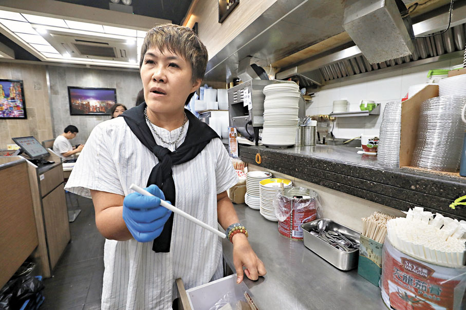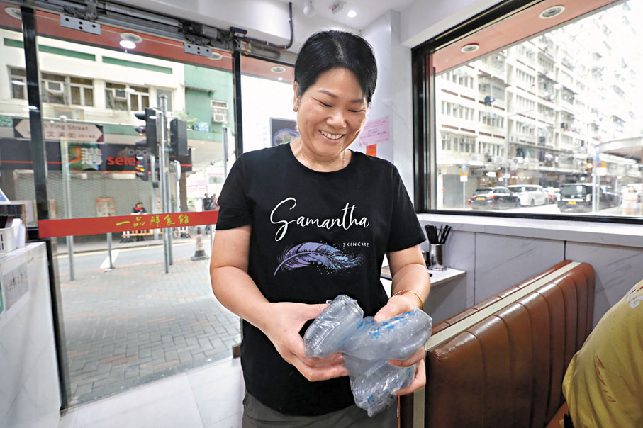 主營麵食的高女士表示,該食肆經營兩年多,主要做街坊熟客生意,堂食居多,外賣較少,法例對經營整體影響不大。「我們沒有製作飲品,都是現成的樽裝或紙包飲品,外賣餐具是筷子,本身就是竹製,就是湯匙要換環保產品。」她表示,外賣客人基本是附近居民,會主動提出不要餐具。