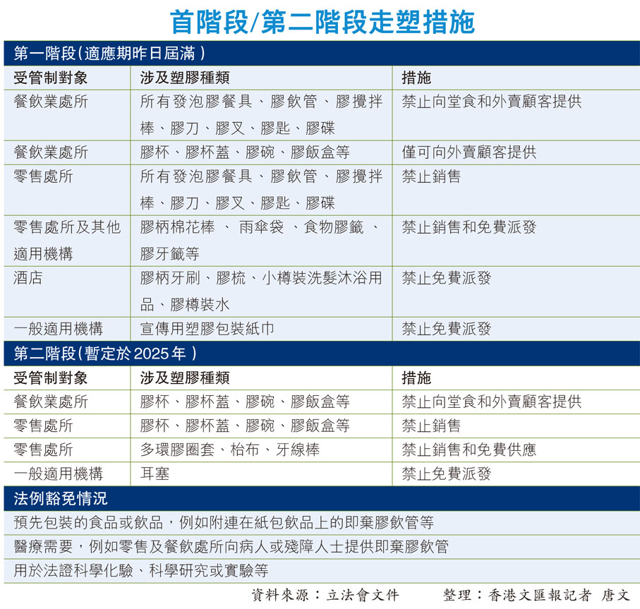 (香港文匯報記者 唐文)在香港,俗稱走塑的管制即棄膠餐具和其他塑膠產品的法例今年4月22日生效,法例賦予的半年適應期昨日屆滿,今日起食肆堂食或外賣提供發泡膠餐具、膠刀叉、膠飲管、膠攪拌棒等均屬違法,商店亦禁止販售。香港文匯報記者昨日巡查九龍佐敦一帶多間食肆,發現大部分餐廳已提前轉用環保餐具,但個別小店仍使用受管制的膠餐具,亦有食肆有大量膠餐具存貨。不少市民趁適應期最後一日搶購塑膠一次性餐具,留作日後自用。記者亦發現,有自稱為合格的環保餐具,疑似含有受管制的塑膠成分,隨時令食肆負責人誤墮法網。