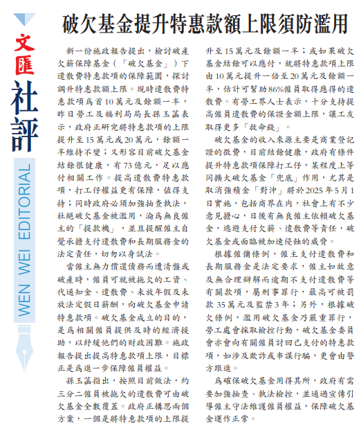 新一份施政報告提出,檢討破產欠薪保障基金(「破欠基金」)下遣散費特惠款項的保障範圍,探討調升特惠款額上限。現時遣散費特惠款項為首10萬元及餘額一半,昨日勞工及福利局局長孫玉菡表示,政府正研究將特惠款項的上限提升至15萬元或20萬元,餘額一半維持不變;又形容目前破欠基金結餘很健康,有73億元,足以應付相關工作。提高遣散費特惠款項,打工仔權益更有保障,值得支持;同時政府必須加強抽查執法,杜絕破欠基金被濫用,淪為無良僱主的「提款機」,並且提醒僱主自覺承擔支付遣散費和長期服務金的法定責任,切勿以身試法。