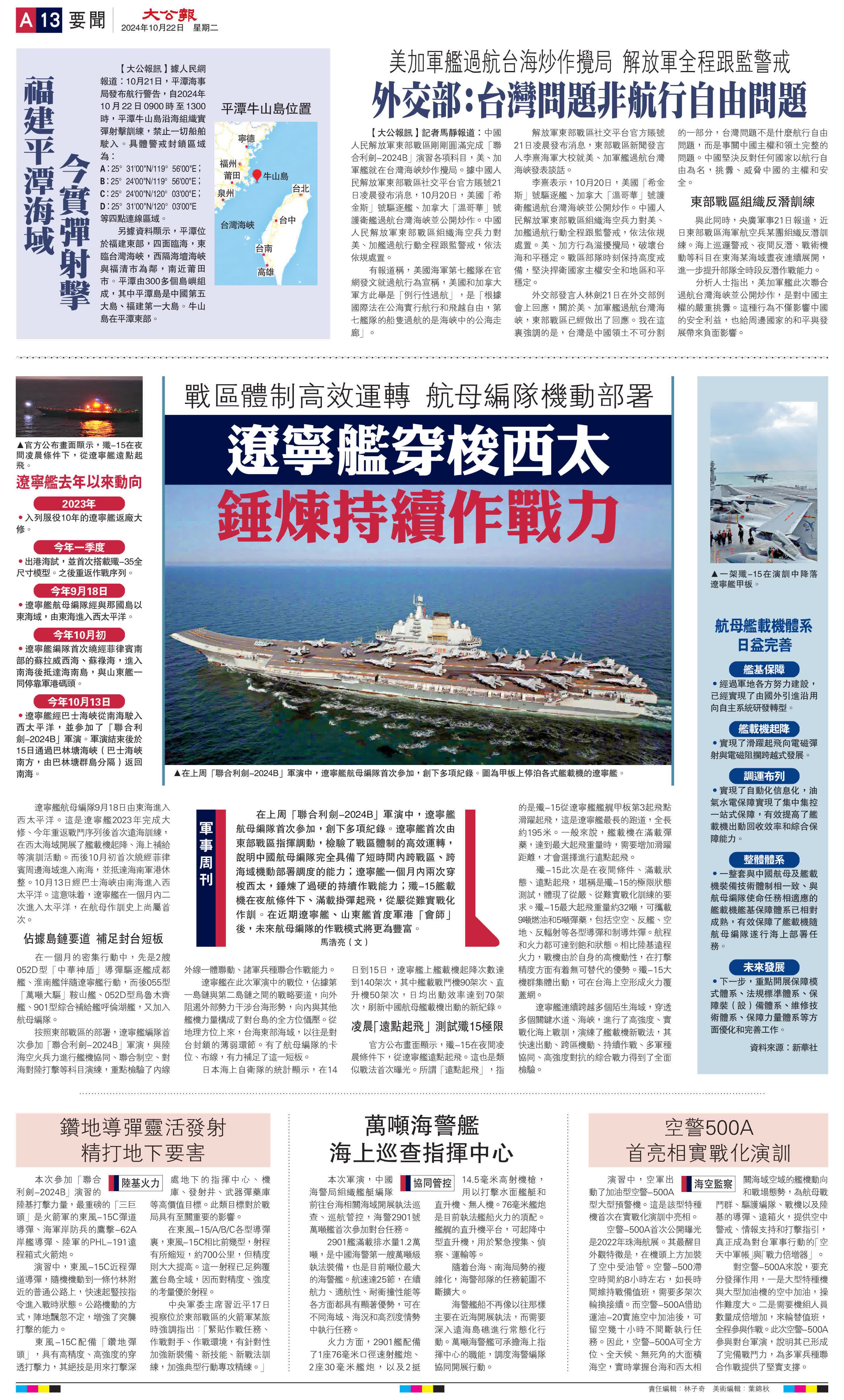 按照東部戰區的部署,遼寧艦編隊首次參加「聯合利劍-2024B」軍演,與陸海空火兵力進行艦機協同、聯合制空、對海對陸打擊等科目演練,重點檢驗了內線外線一體聯動、諸軍兵種聯合作戰能力。