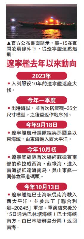 遼寧艦航母編隊9月18日由東海進入西太平洋。這是遼寧艦2023年完成大修、今年重返戰鬥序列後首次遠海訓練,在西太海域開展了艦載機起降、海上補給等演訓活動。而後10月初首次繞經菲律賓周邊海域進入南海,並抵達海南軍港休整。10月13日經巴士海峽由南海進入西太平洋。這意味着,遼寧艦在一個月內二次進入太平洋,在航母作訓史上尚屬首次。