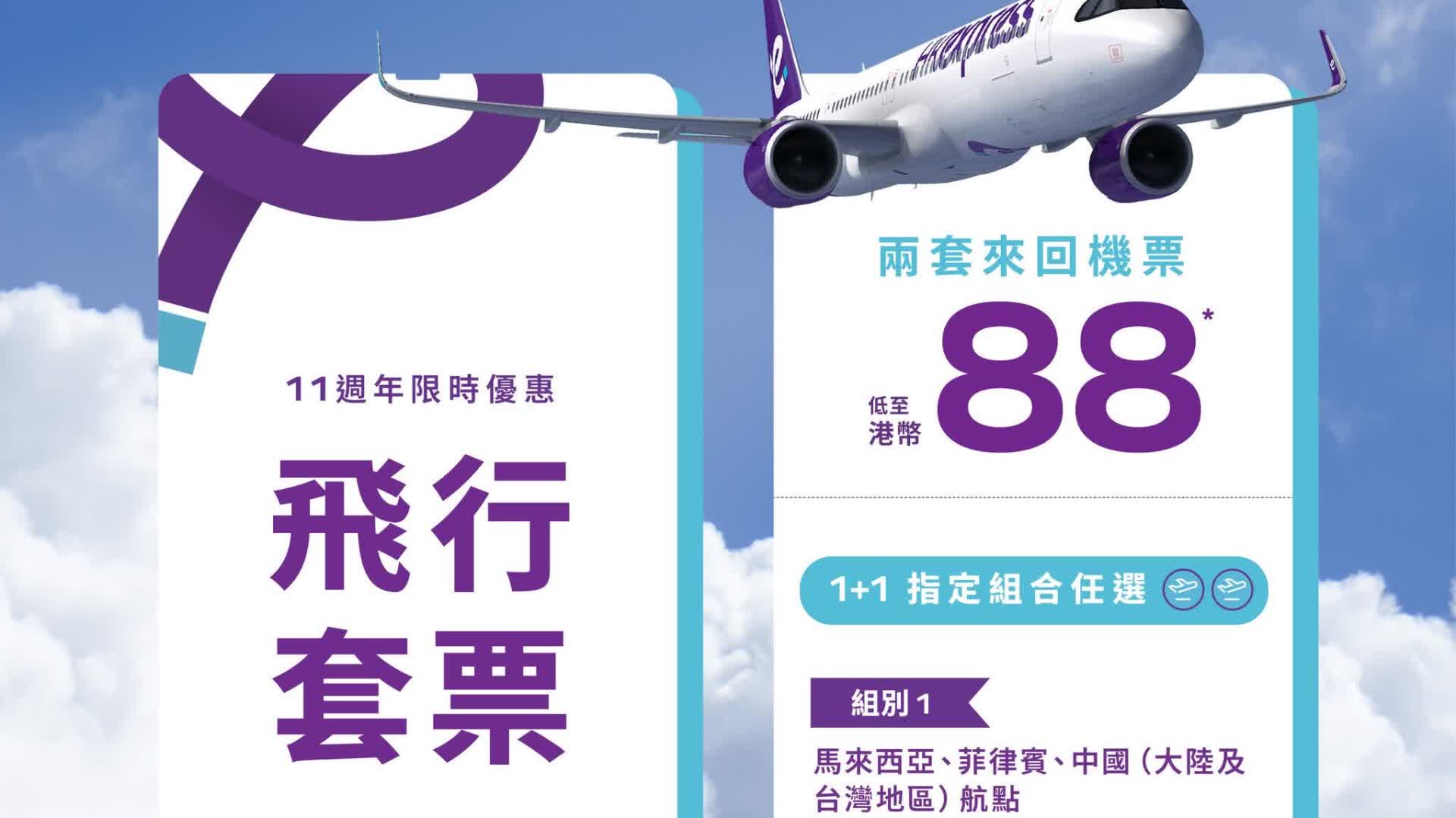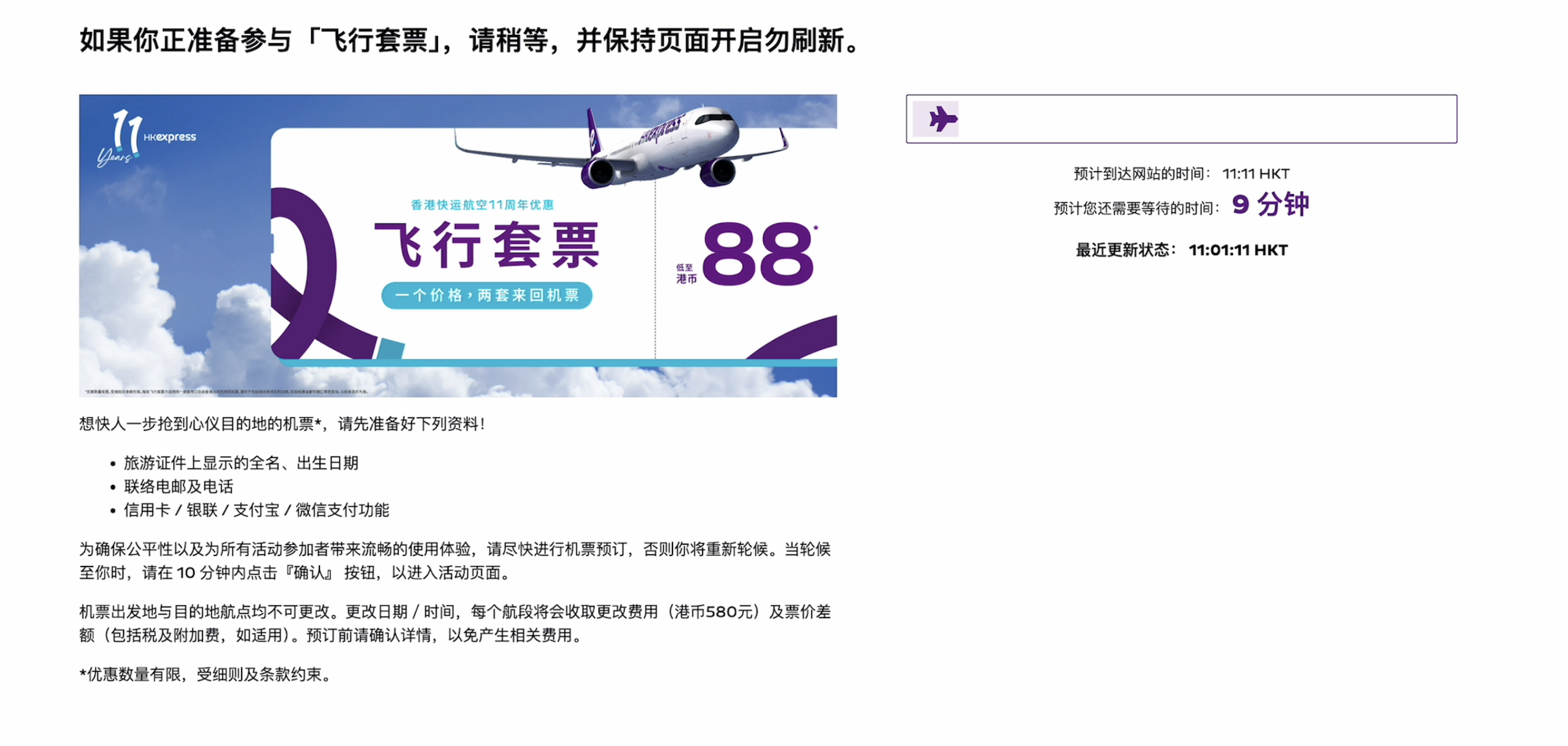 大公文匯全媒體記者張宇涵、子言報道,HK Express 11周年震撼優惠今日(22日)早上11時起推出,兩套來回機票低至港幣88元。大公文匯全媒體記者準時等候,發現HK Express在上午11時才在Facebook網頁上載連結。大公文匯全媒體記者第一時間點擊進入搶票頁面,發現需等待9分鐘。