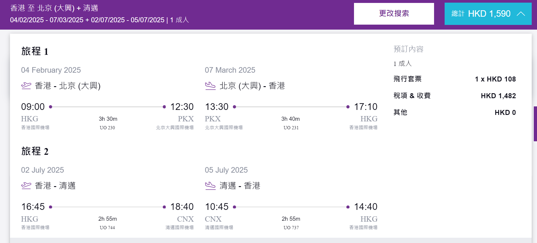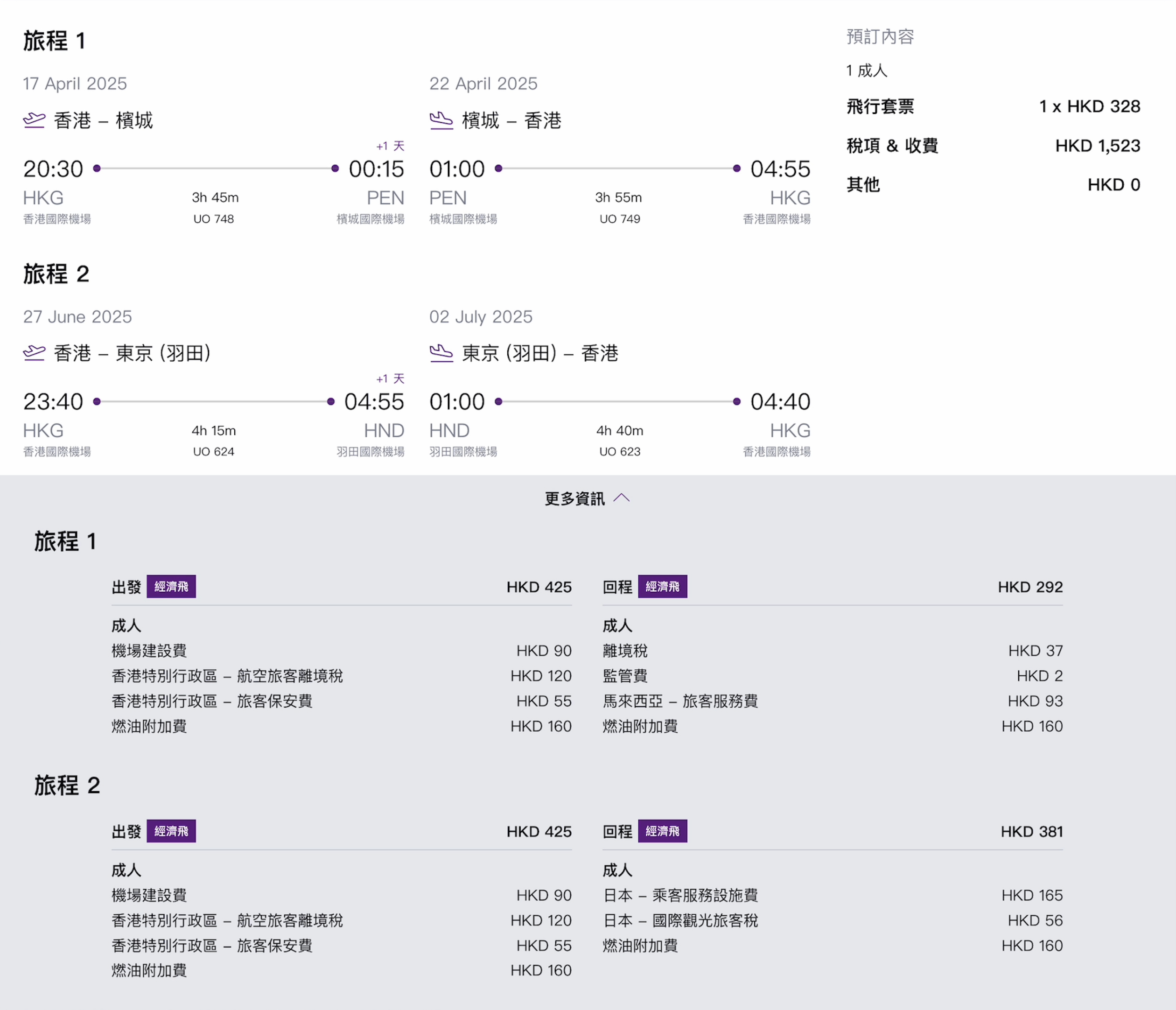 3.實際付款的每段行程價格非88元港幣,還需加上離境稅和燃油附加費後,兩段往返航程約1800元。