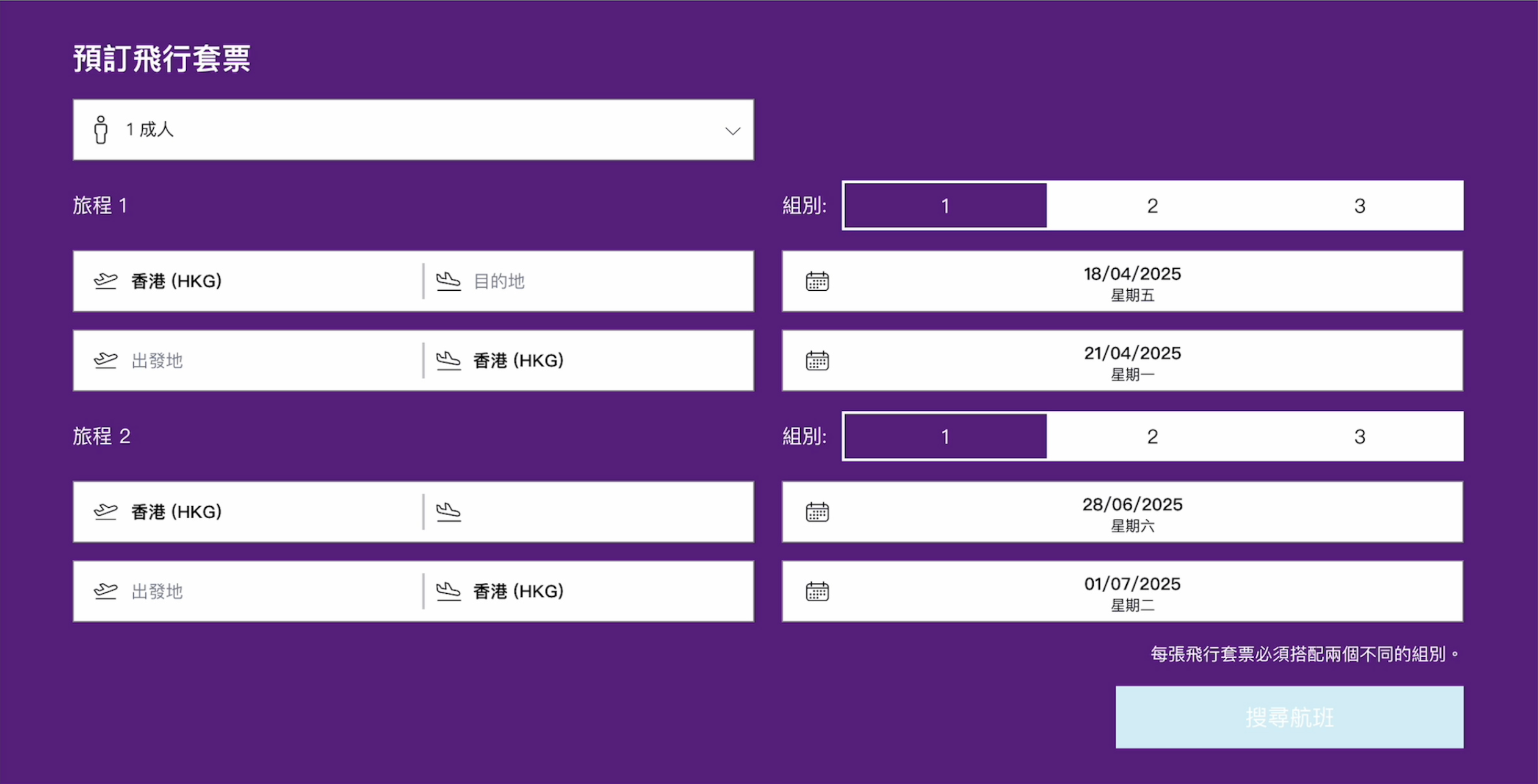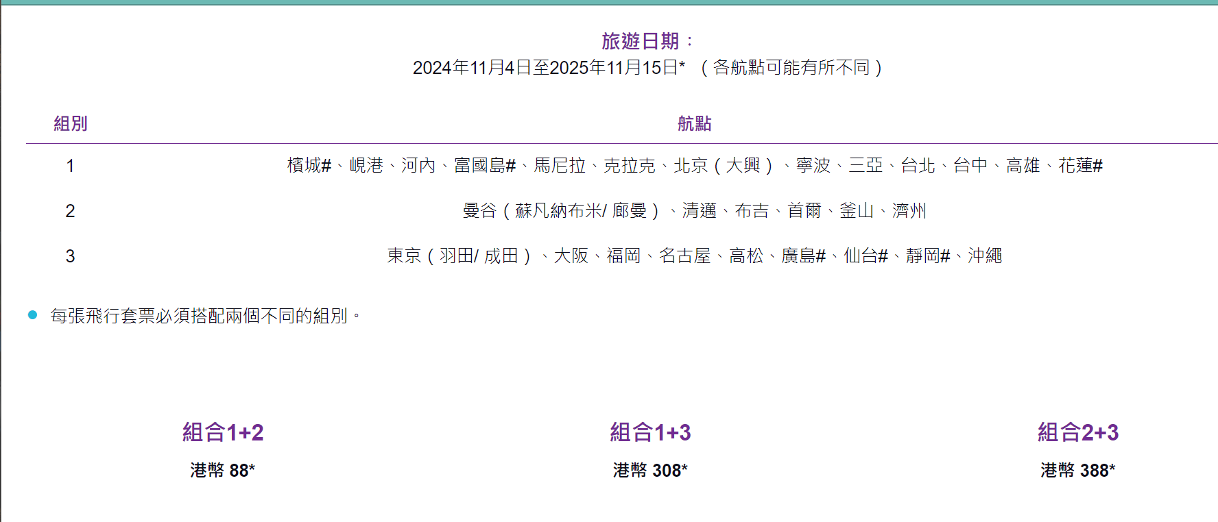1.航點被分為3個組別,兩組航程需選擇兩個不同組別,不可重複。當中,檳城的首航日期為2024年11月21日,富國島為2024年12月6日,花蓮為2024年12月12日,廣島為2024年11月1日,仙台為2025年1月17日,靜岡為2024年12月17日。