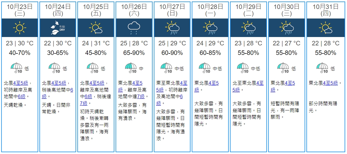 至於潭美能否造成八號烈風或暴風信號,梁榮武表示現時來看機會不大,而按照目前天文台九天天氣預測,未來九天沒有一天風力達8級(即烈風水平)以上。而即使假設「打成風」,亦較大機會在本周六發出更高訊號,他笑言「應該冇可能唔使返工」。