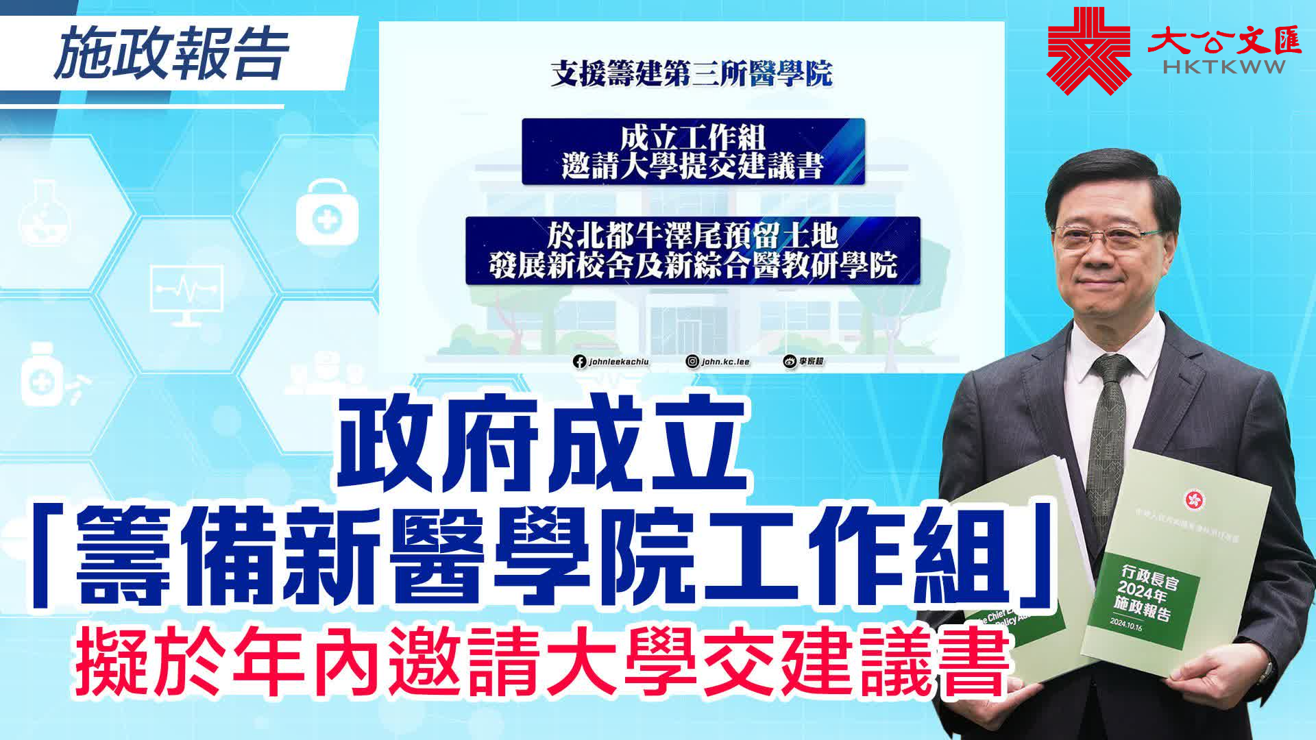 工作組首個目標是於今年內邀請有意成立新醫學院的本地大學提交建議書。工作組將會與各大學溝通並評估建議書,處理資金安排、課程認證、師生來源、教學醫院和研究等相關事宜,然後就設立新醫學院及相關安排向行政長官會同行政會議提出建議。政府會在北部都會區牛潭尾預留土地,備用作興建新醫學院校舍及配套的綜合醫教研醫院。