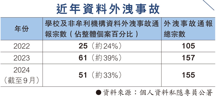 鍾麗玲指出,近年涉及學校及非牟利機構的資料外洩事故明顯上升,去年接獲的157宗資料外洩事故中,學校及非牟利機構的個案佔整體個案約 39%,比2022年上升接近一倍半,鍾麗玲估計或因學校及非牟利機構存放大量個人資料,令黑客有利可圖,而這些機構的保安意識欠佳,沒有做足相關保安工作,導致外洩事故發生。