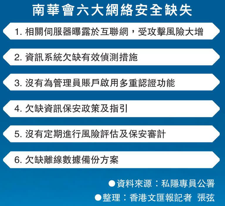 個人資料私隱專員鍾麗玲批評,南華會在外洩事件發生前未有採取所有切實可行的步驟,以確保涉事的個人資料受保障,違反了《私隱條例》保障資料第4(1)原則中有關個人資料保安的規定。事件亦顯示,南華會保障個人資料的安全意識薄弱,存在六大缺失,其中之一是資訊系統欠缺有效偵測措施。
