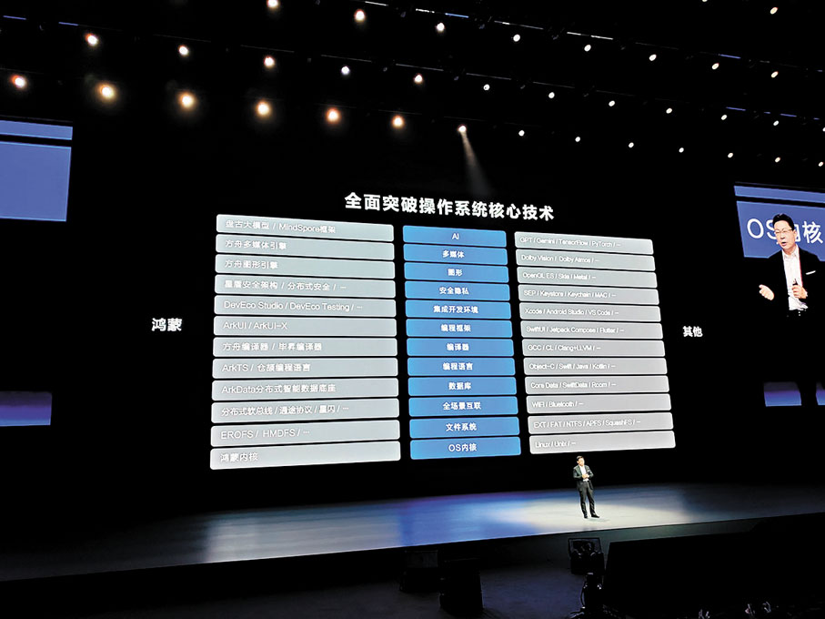 (香港文匯報記者 郭若溪 深圳報道)在昨晚的「原生鴻蒙之夜暨華為全場景新品發布會」上,備受期待的原生鴻蒙操作系統HarmonyOS NEXT(又稱HarmonyOS 5.0 或純血鴻蒙)正式推出,這是內地首個國產移動操作系統,也是繼蘋果iOS和安卓系統後,全球第三大移動操作系統。標誌着華為在移動操作系統領域取得了重大突破,實現操作系統的自主可控。新發布的系統首次融入原生AI能力,用戶「碰一碰」即可分享圖片和淘寶鏈接等。同日,純血鴻蒙將開啟華為Pura 70系列、華為Pocket 2系列和華為MatePad Pro 11吋2024款三款設備公測。