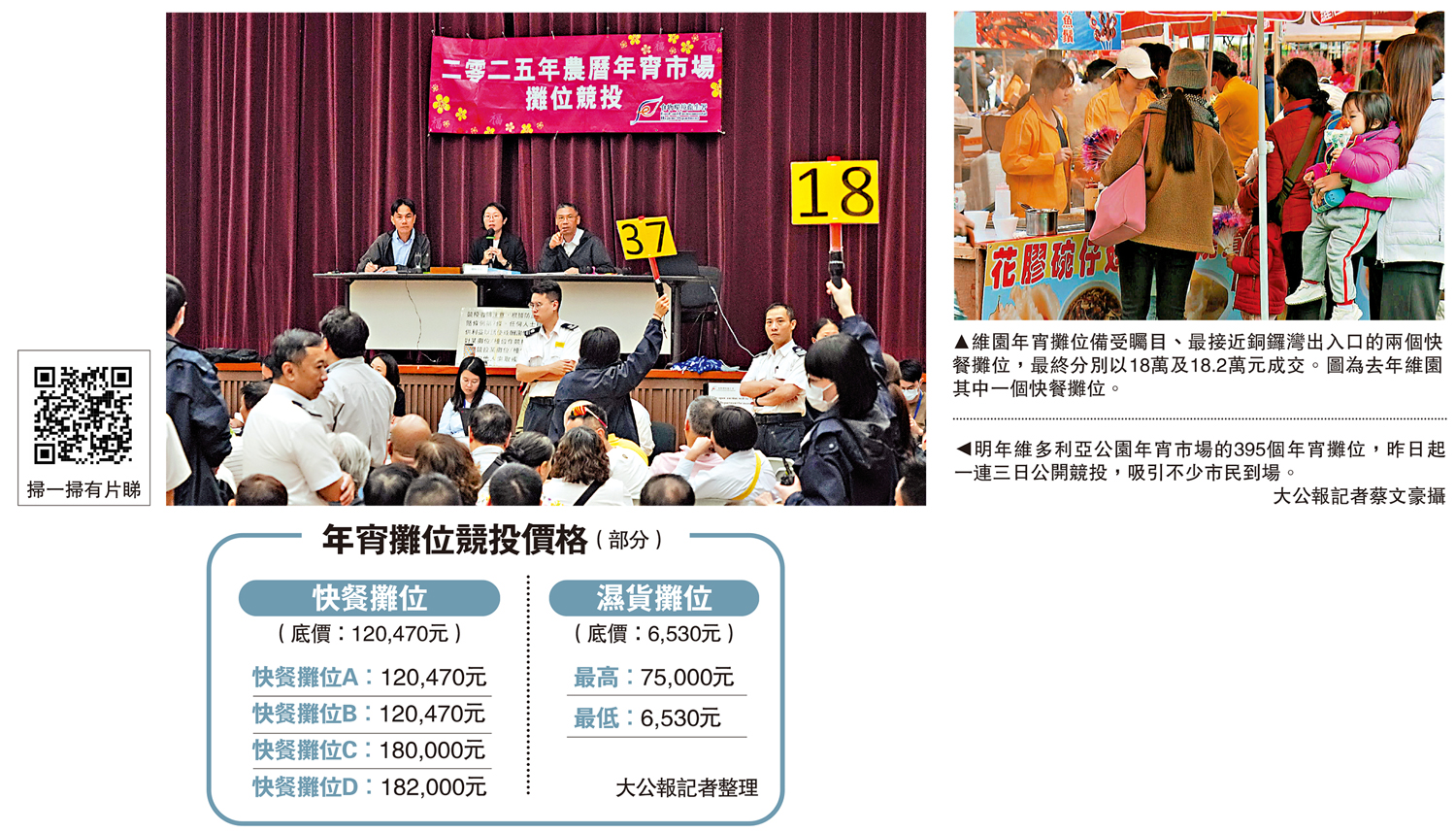 (大公報 記者 鍾佩欣、蔡文豪、鄧浩朗)全港最大規模的銅鑼灣維園農曆年宵市場,昨日展開一連三日攤位公開競投,首日推出四個快餐攤位及175個濕貨攤位,當中的快餐攤位D以全日最高價18.2萬元成交,較底價高出51%,但低過去年的最高成交價,而濕貨攤位最高成交價為7.5萬元。