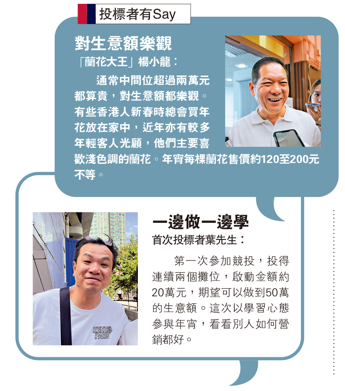 維園年宵常客、「蘭花大王」楊小龍昨日以約15萬元投得七個濕貨攤位,最高成交價為4.4萬元。他對年宵市況樂觀,「有些香港人都會放一盆(年花)在家中」,而近年較多年輕人光顧,所以會選擇淺色為主的蘭花。他認為最重要是做好口碑,目前未預計生意額。