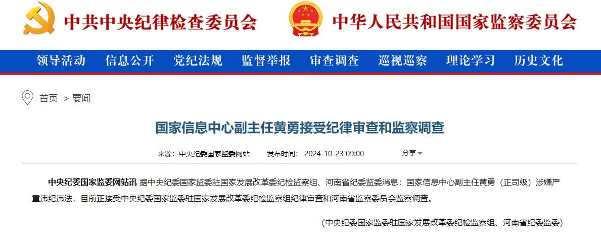 據中央紀委國家監委駐國家發展改革委紀檢監察組、河南省紀委監委消息:國家信息中心副主任黃勇(正司級)涉嫌嚴重違紀違法,目前正接受中央紀委國家監委駐國家發展改革委紀檢監察組紀律審查和河南省監察委員會監察調查。