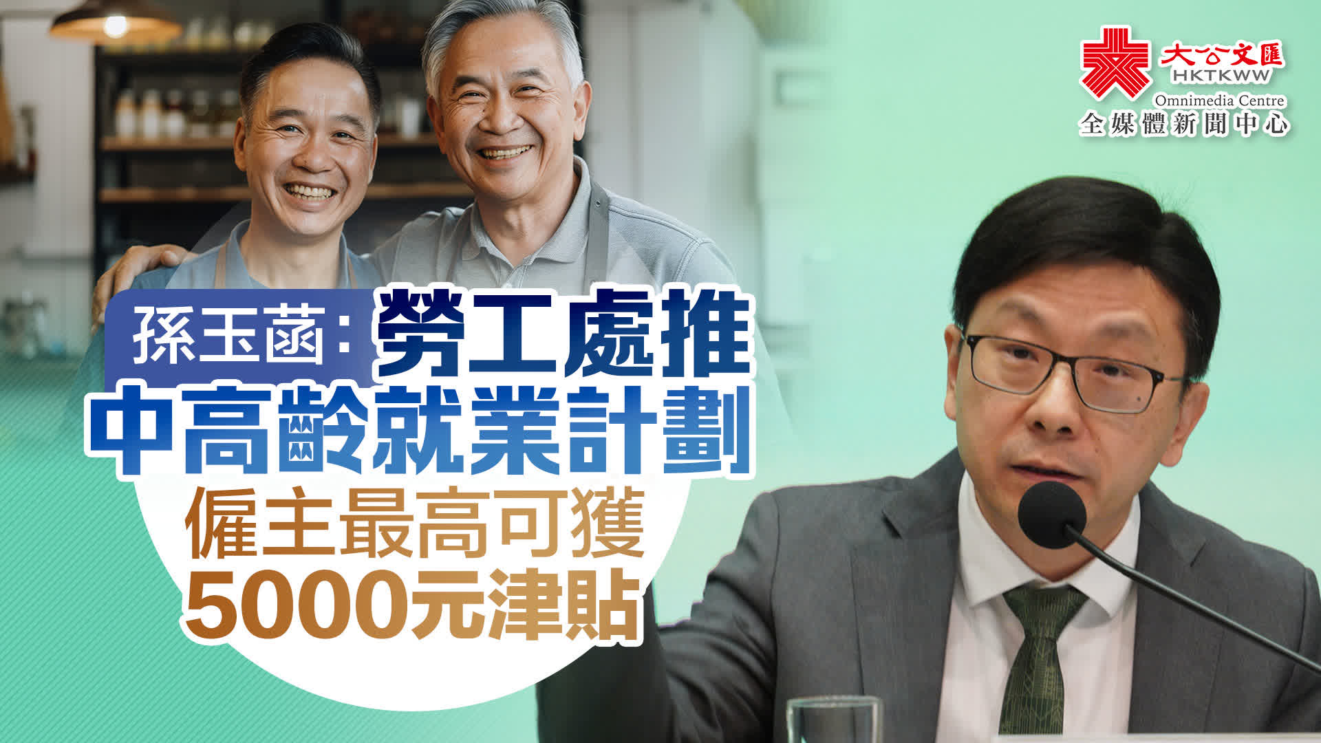 孫玉菡還表示,勞工處推行「中高齡就業計劃」,僱主在該計劃下聘用每名60歲或以上合資格求職人士,可獲發每月最高5,000元在職培訓津貼,為期6至12個月。為進一步鼓勵僱主聘請再就業計劃參加者,勞工處已統一延長僱主在「中高齡就業計劃」下聘請60歲以上再就業計劃參加者的在職培訓期至12個月。