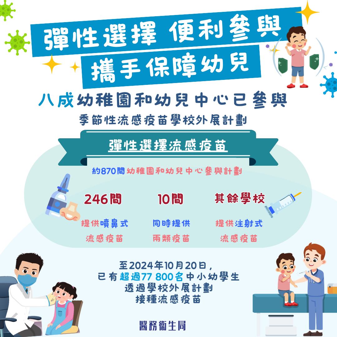 季節性流感疫苗學校外展計劃今年實施特別安排,幼稚園和幼兒中心可於同一或不同的外展活動自由選用注射式滅活和噴鼻式減活流感疫苗。目前860間幼稚園和幼兒中心已為學童安排疫苗接種活動。當中246間學校提供噴鼻式減活流感疫苗,七間學校提供注射式滅活和噴鼻式減活流感疫苗,其餘學校則提供注射式滅活流感疫苗。