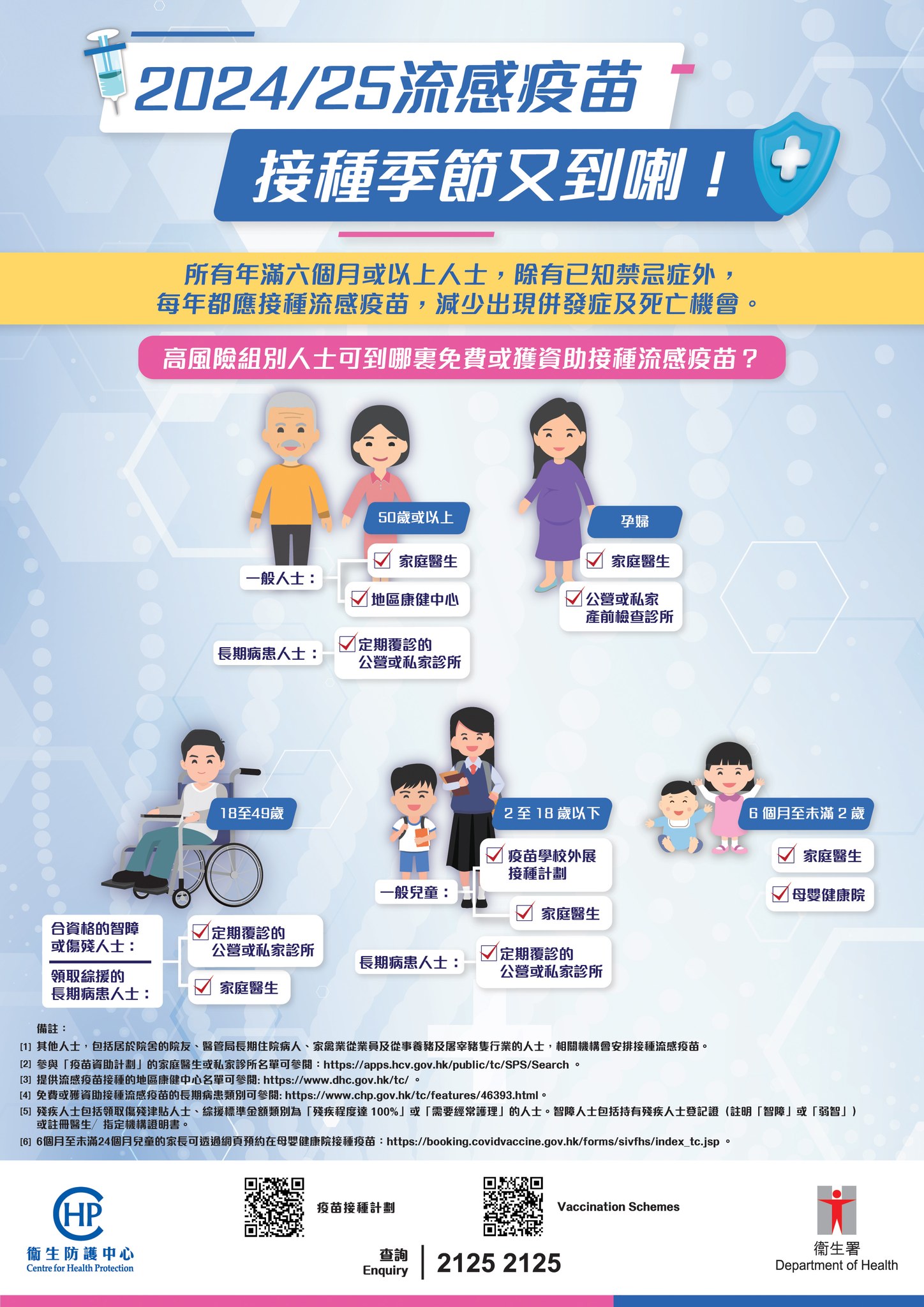 | 18至49歲的智障/傷殘人士或領取綜援的長期病患人士 | 由家庭醫生、定期覆診的公營或私家診所接種 |