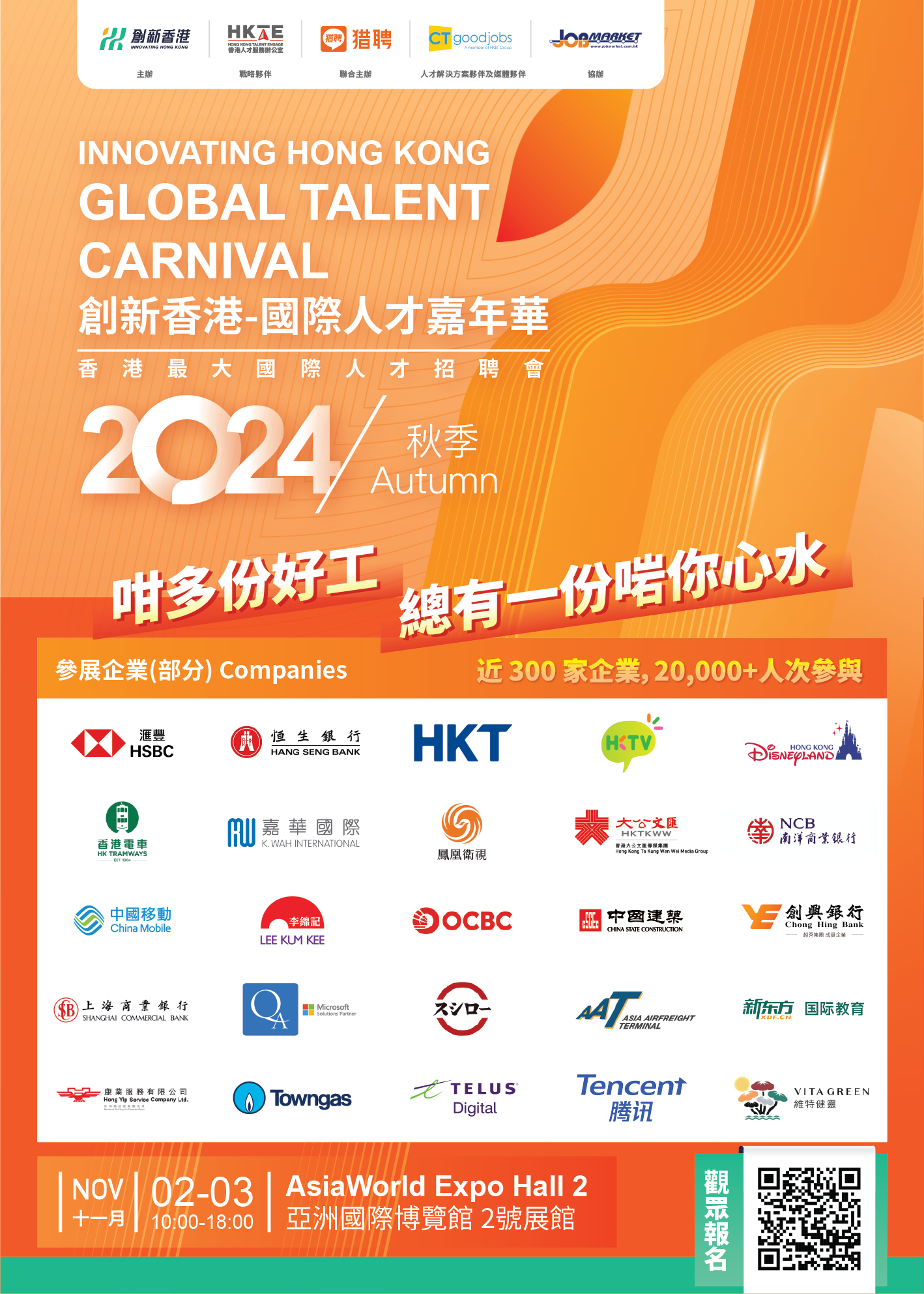 今年嘉年華將迎來史上最大規模、最多參與人次、最強曝光量。各位應屆畢業生以及打算尋求新機遇的「打工仔」,請立即登記參加國際人才嘉年華2024(秋季),並帶上你的簡歷,在11月2日至3日蒞臨創新香港—國際人才嘉年華,探尋那份專屬於你的理想職業,開啟人生新篇章!
