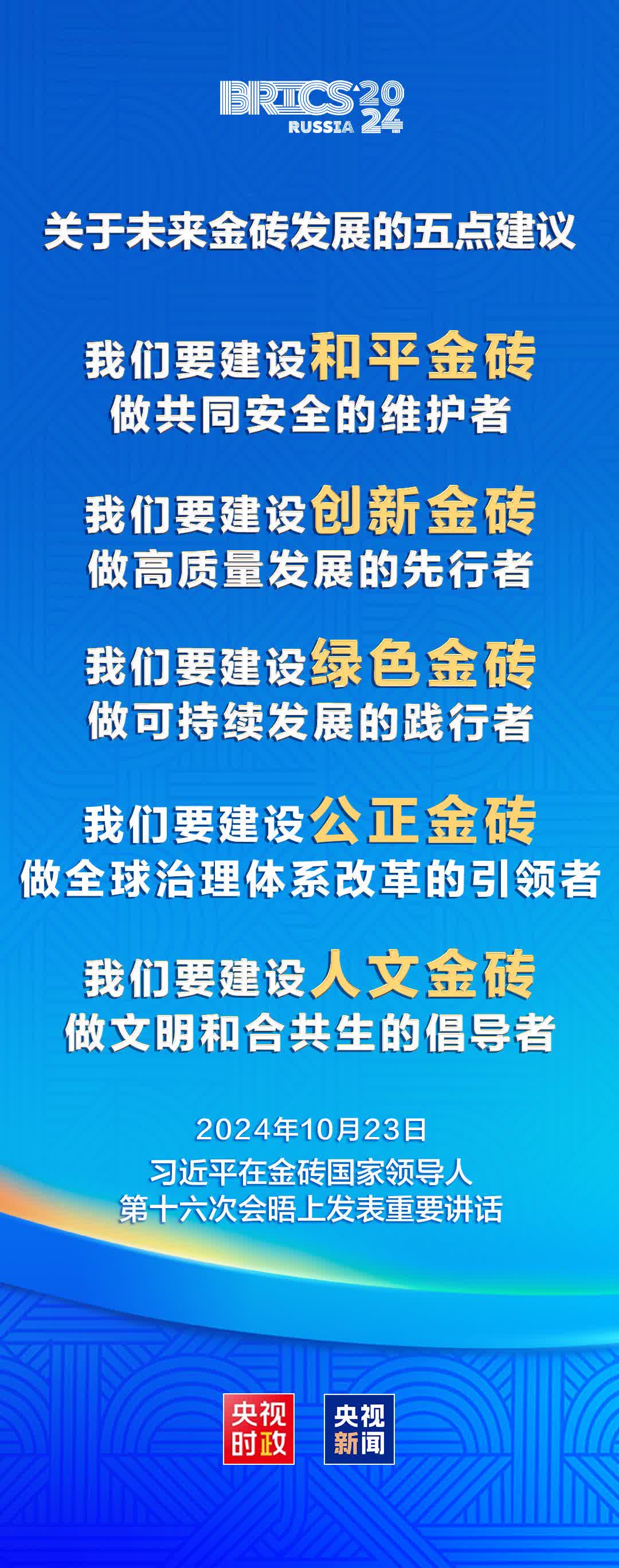 習近平指出,我們要建設「公正金磚」,做全球治理體系改革的引領者。國際力量對比正在深刻演變,但全球治理體系改革長期滯後。要踐行真正的多邊主義,堅持共商共建共享的全球治理觀,以公平正義、開放包容為理念引領全球治理改革,提升全球南方國家的代表性和發言權。促進金融基礎設施互聯互通,維護高水平金融安全,做大做強新開發銀行,推動國際金融體系更好反映世界經濟格局變化。