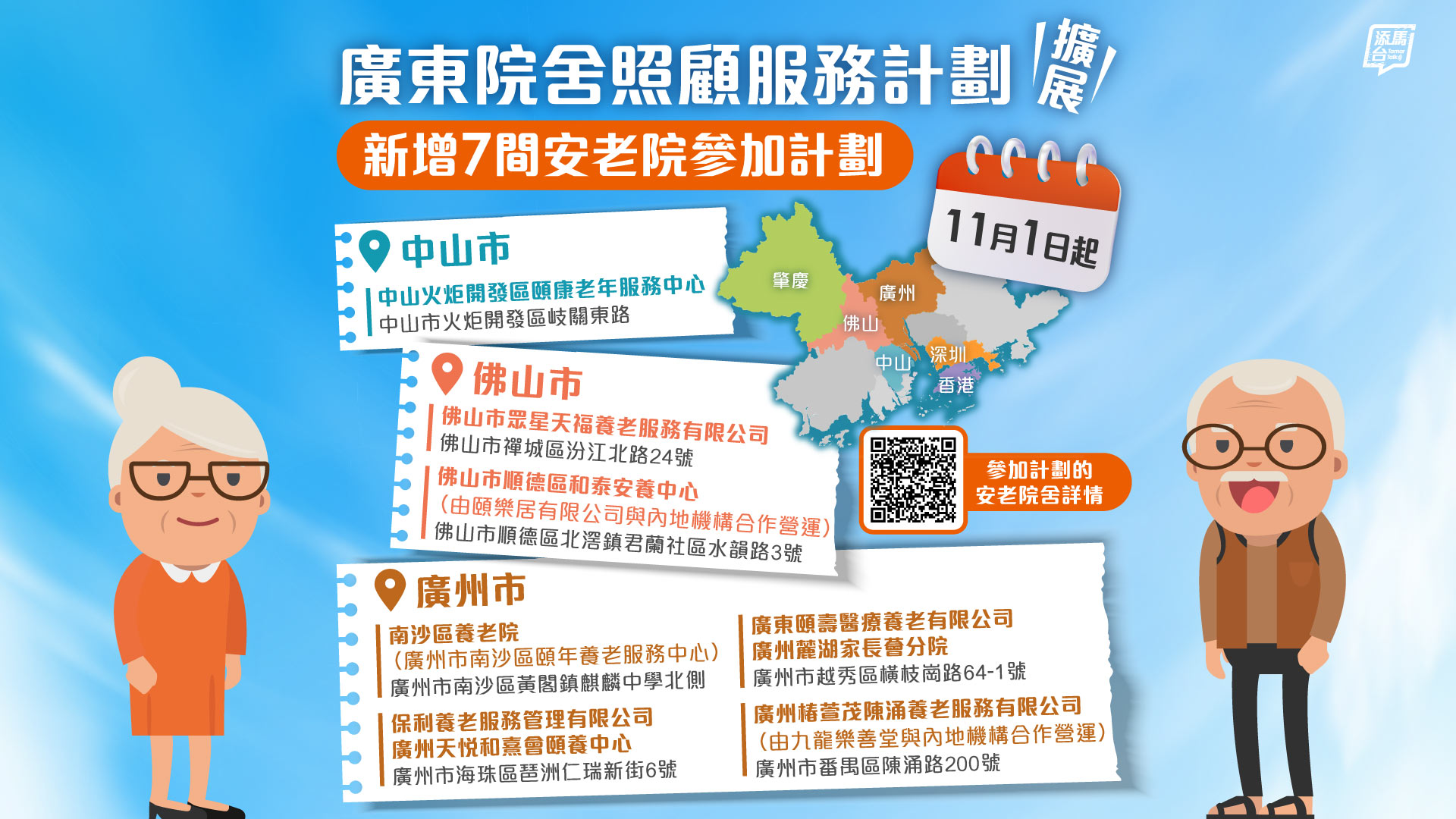 有意在大灣區內地城市養老的長者注意!由11月1日起,「廣東院舍照顧服務計劃」將新增7間安老院為認可服務機構,分布於廣州、佛山和中山,提供資助護理安老宿位。看圖了解更多。