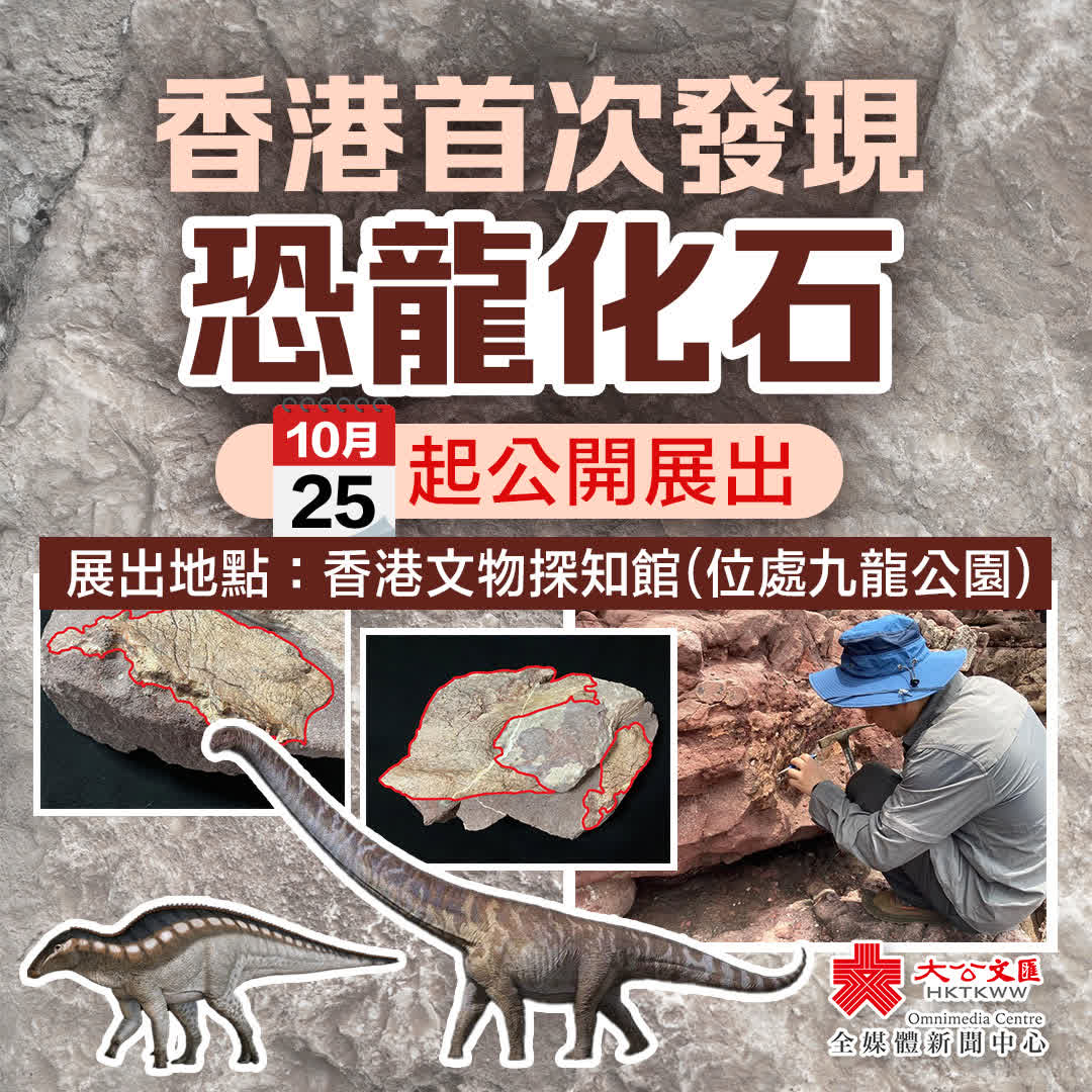 大公文匯全媒體報道,發展局今日(23日)公布,香港赤洲日前首次發現恐龍化石,估計屬於白堊紀時期(距今約1億4500萬年至6600萬年前),確定樣本屬於大型恐龍骨骼化石,推斷或為蜥腳類恐龍或鳥臀類恐龍。