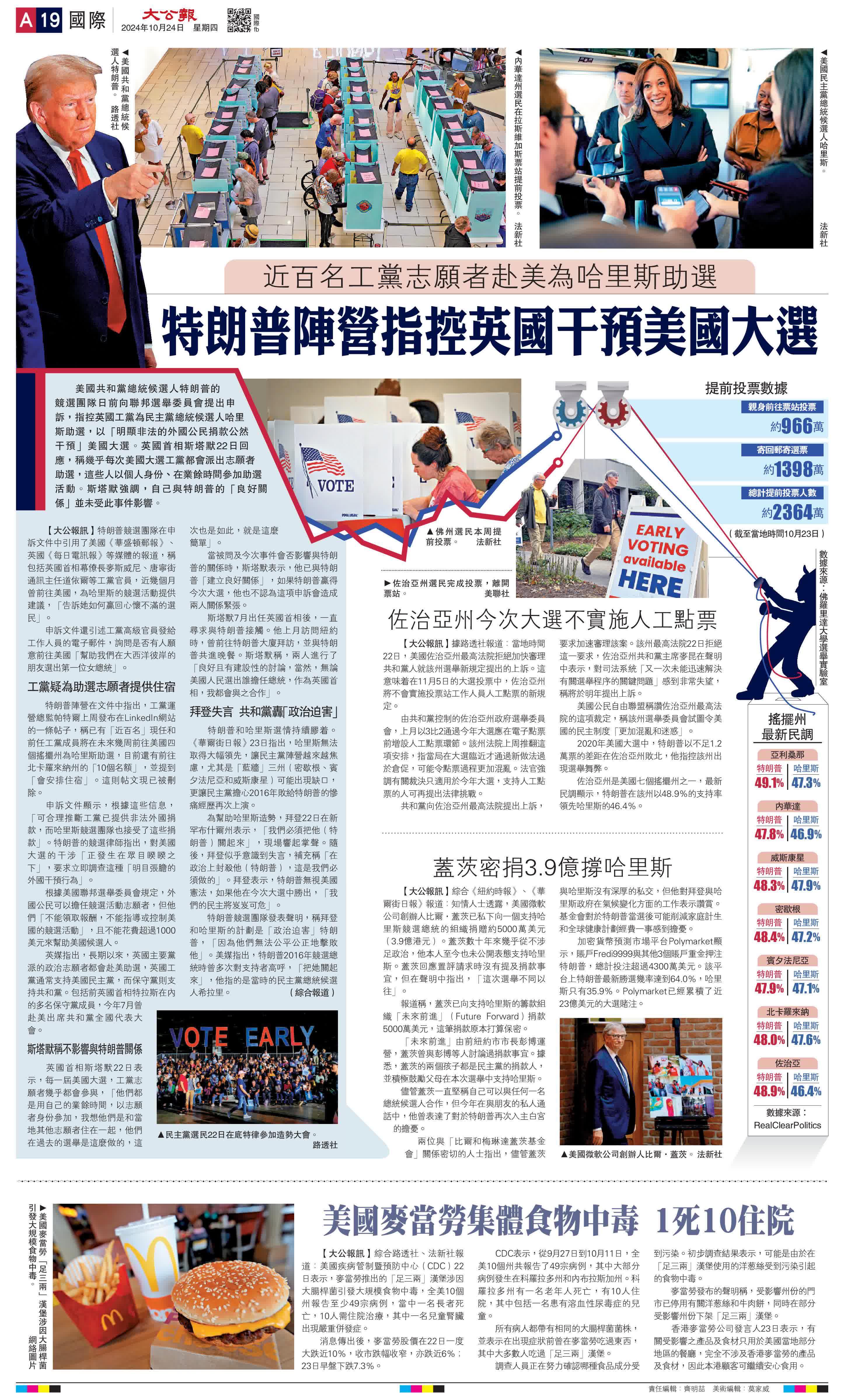 特朗普和哈里斯選情持續膠着。《華爾街日報》23日指出,哈里斯無法取得大幅領先,讓民主黨陣營越來越焦慮,尤其是「藍牆」三州(密歇根、賓夕法尼亞和威斯康星)可能出現缺口,更讓民主黨擔心2016年敗給特朗普的慘痛經歷再次上演。