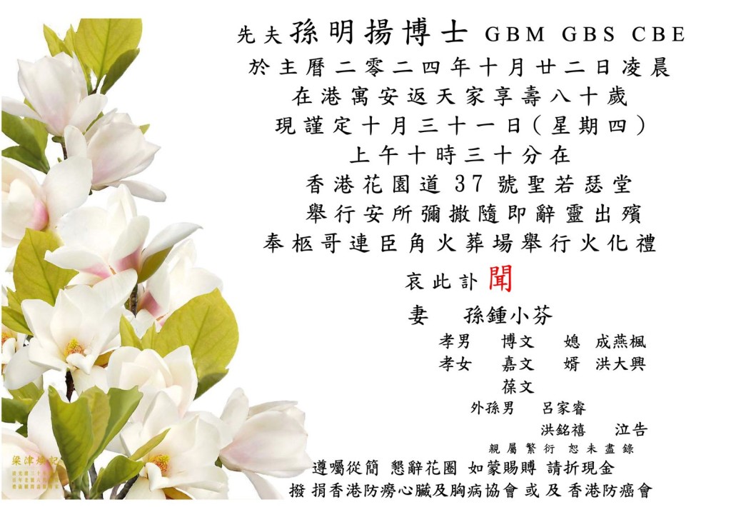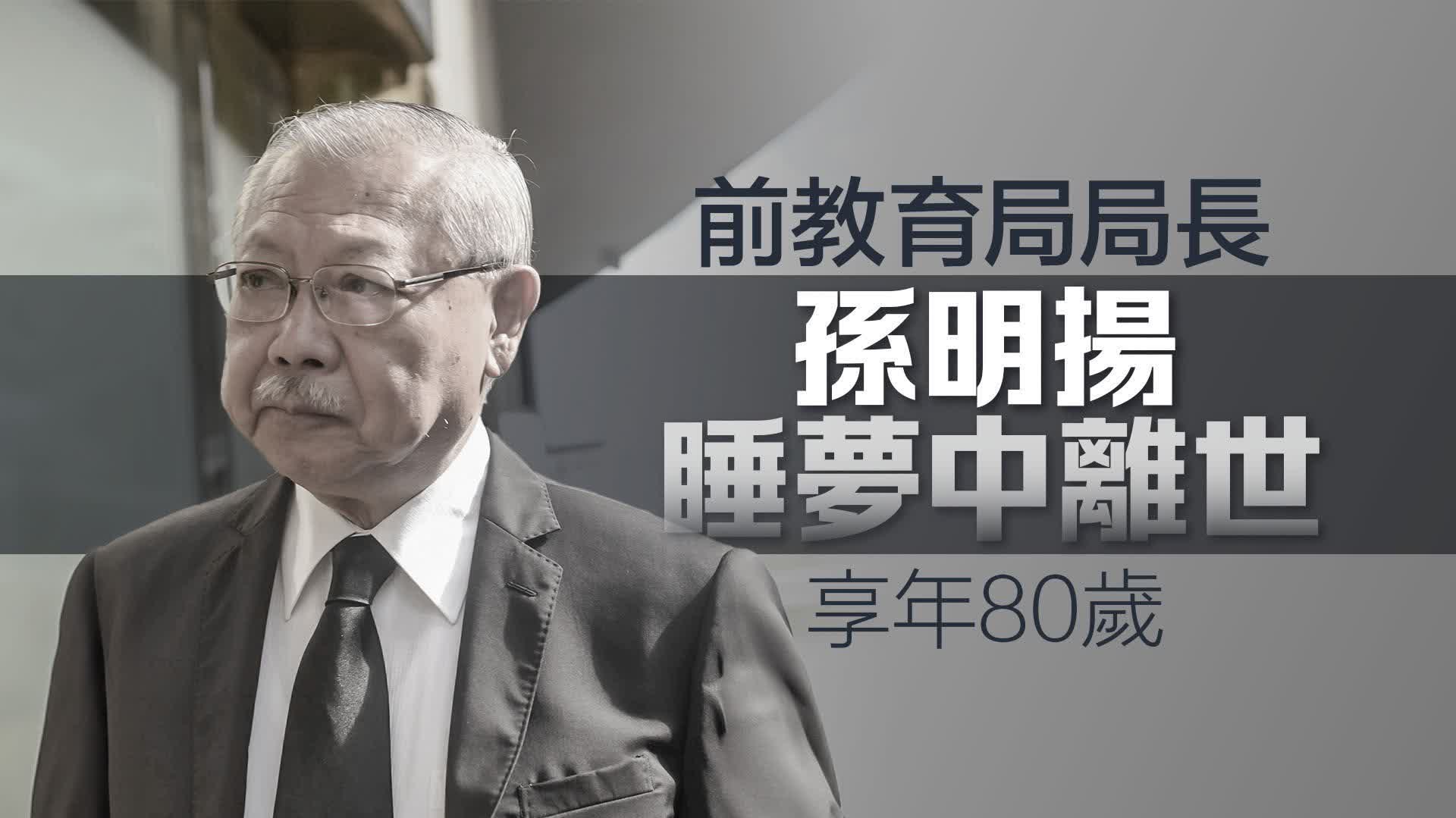 大公文匯全媒體報道,前教育局局長孫明揚10月22日凌晨在睡夢中安詳離世,享年80歲。其家人發訃聞,訂於下周四(31日)早上在花園道聖若瑟堂舉行安所彌撒,並隨即辭靈出殯,奉柩到哥連臣角火葬場舉行火化禮。