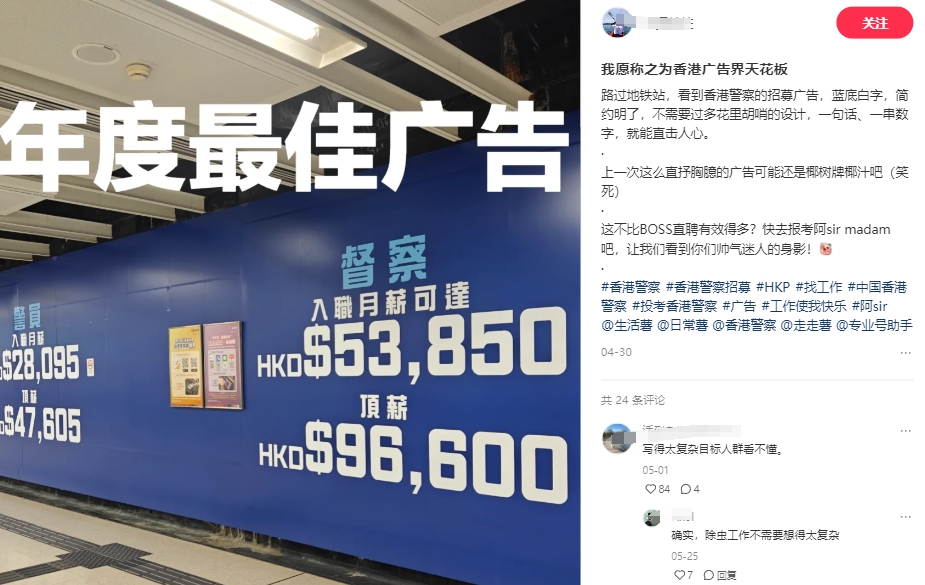 香港警察地鐵招募廣告,藍底白字,簡約明了,一句話、一串數字,就能直擊人心,夠霸氣!