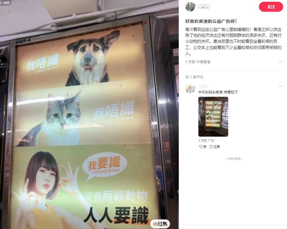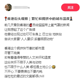「香港這個擁擠快節奏的都市儘管不完美,卻有着值得誇讚的人文關懷和溫度,這份關懷不限於人類與動物。」