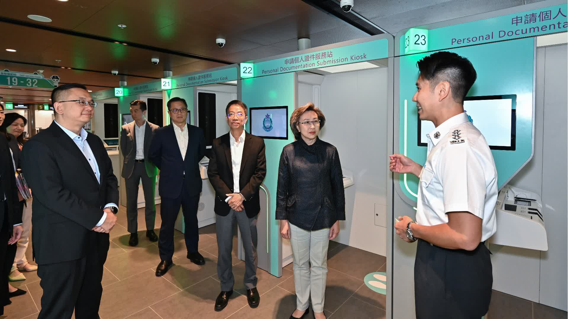 楊何蓓茵隨後參觀人事登記辦事處,入境處職員向她介紹入境處總部的自助個人證件服務。全新的「申請個人證件服務站」現時讓市民自助申請特區護照,未來更將會首次引入自助申請身份證的服務,省時便捷。「領取個人證件服務站」則整合了現有各種領取證件服務站的功能。新設置的服務站進一步方便市民以自助形式辦理個人證件的申領手續,藉以提供更優質的公共服務。
