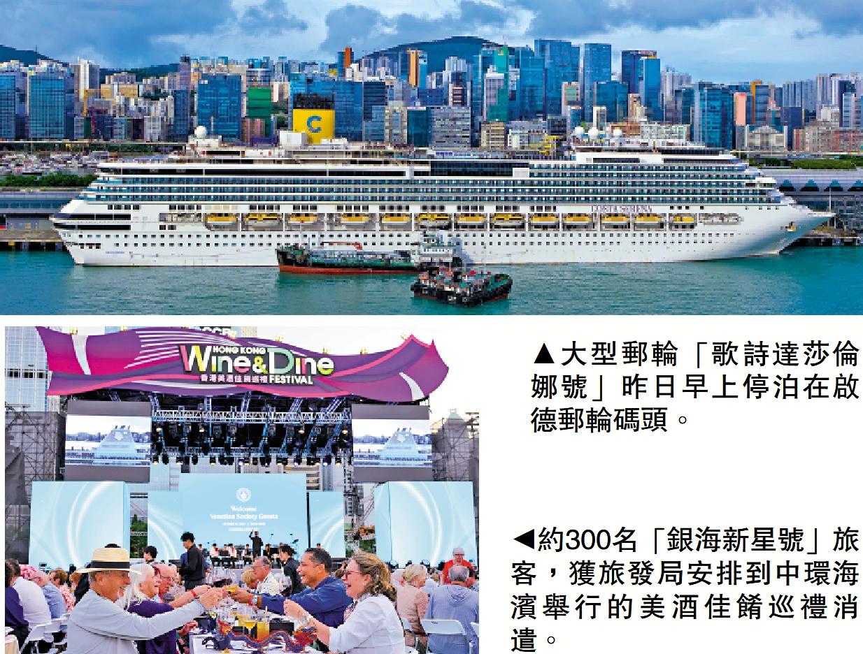 「銀海新星號」昨早停泊尖沙咀海運碼頭,船上大約有500名旅客,將於香港逗留兩日一夜,當中約300名旅客晚上會到美酒佳餚巡禮,旅發局為旅客準備了岸上特色餐飲體驗活動,包括觀看交響樂團演出,以及品嘗米芝蓮星級點心與中國葡萄酒。有來自美國的旅客表示,將會到山頂遊覽,並表示想品嘗各種中式點心。